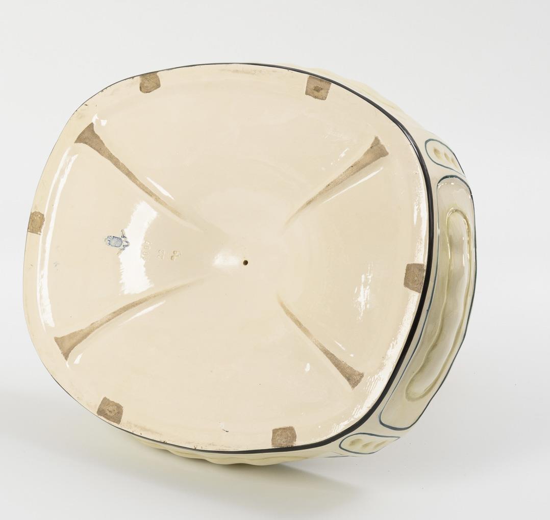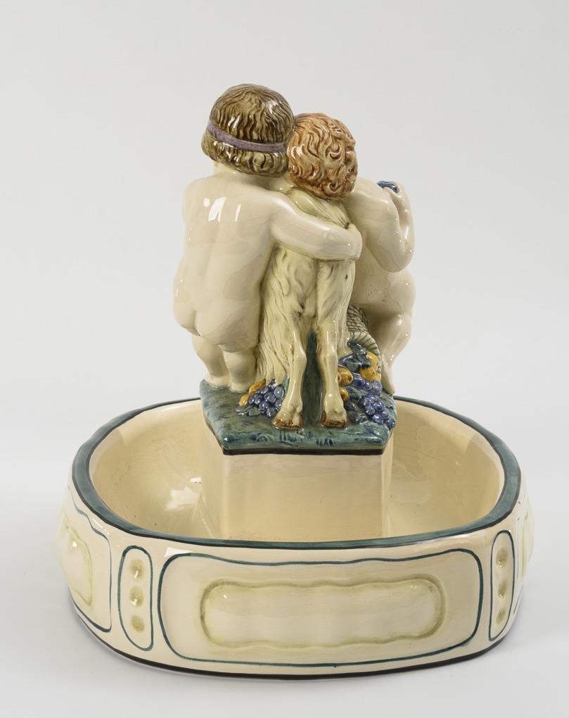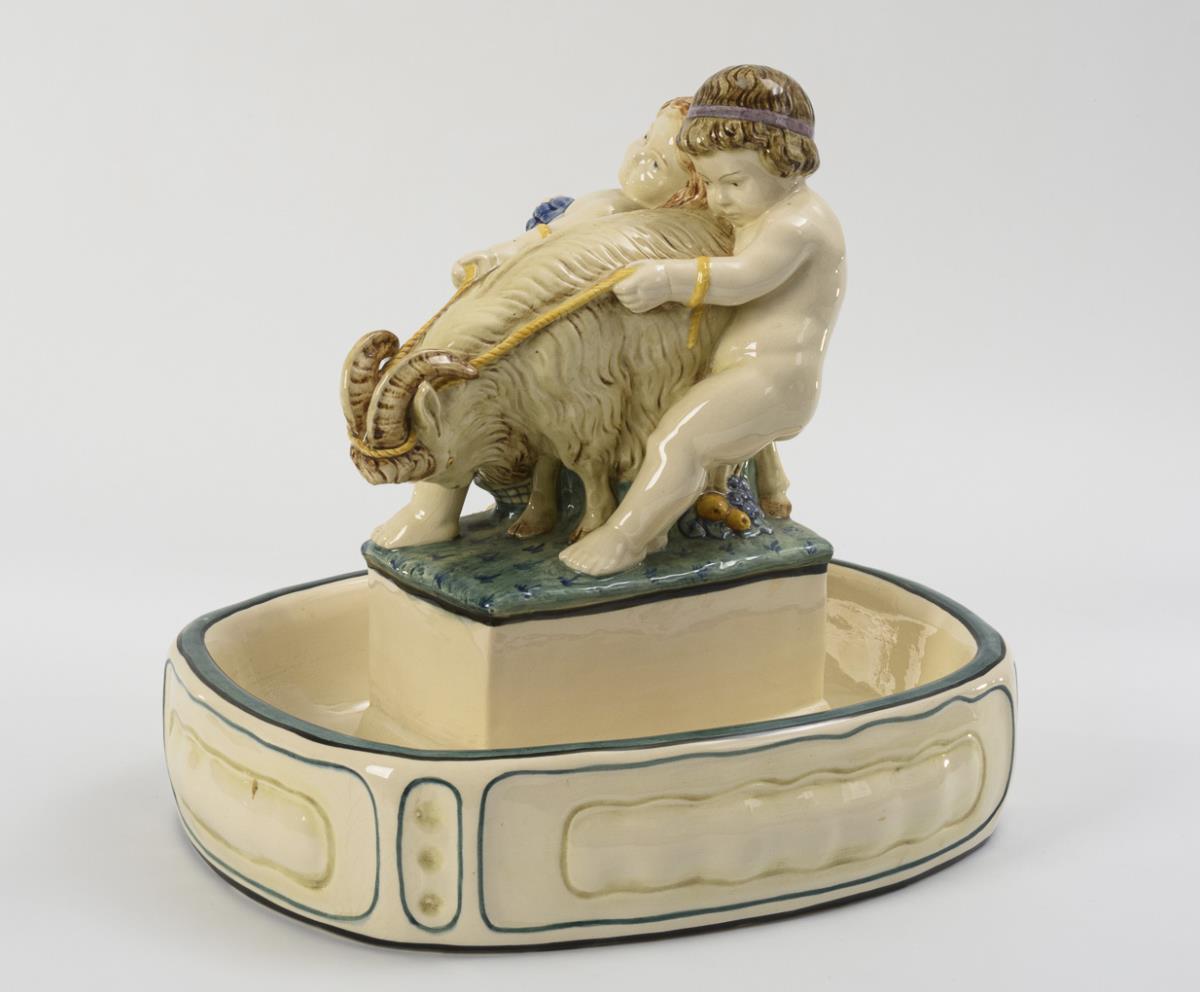 Großer Tafelaufsatz mit 2 Putten und Ziegenbock. Karlsruher Majolika.