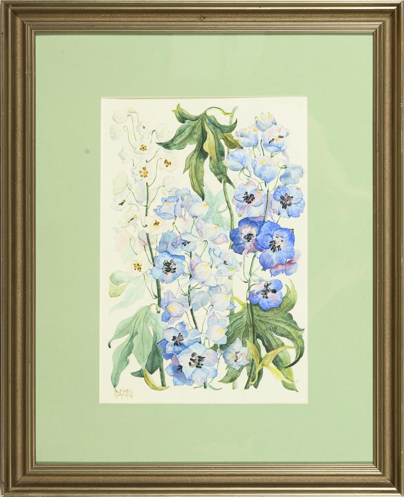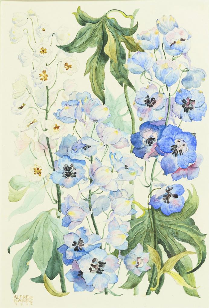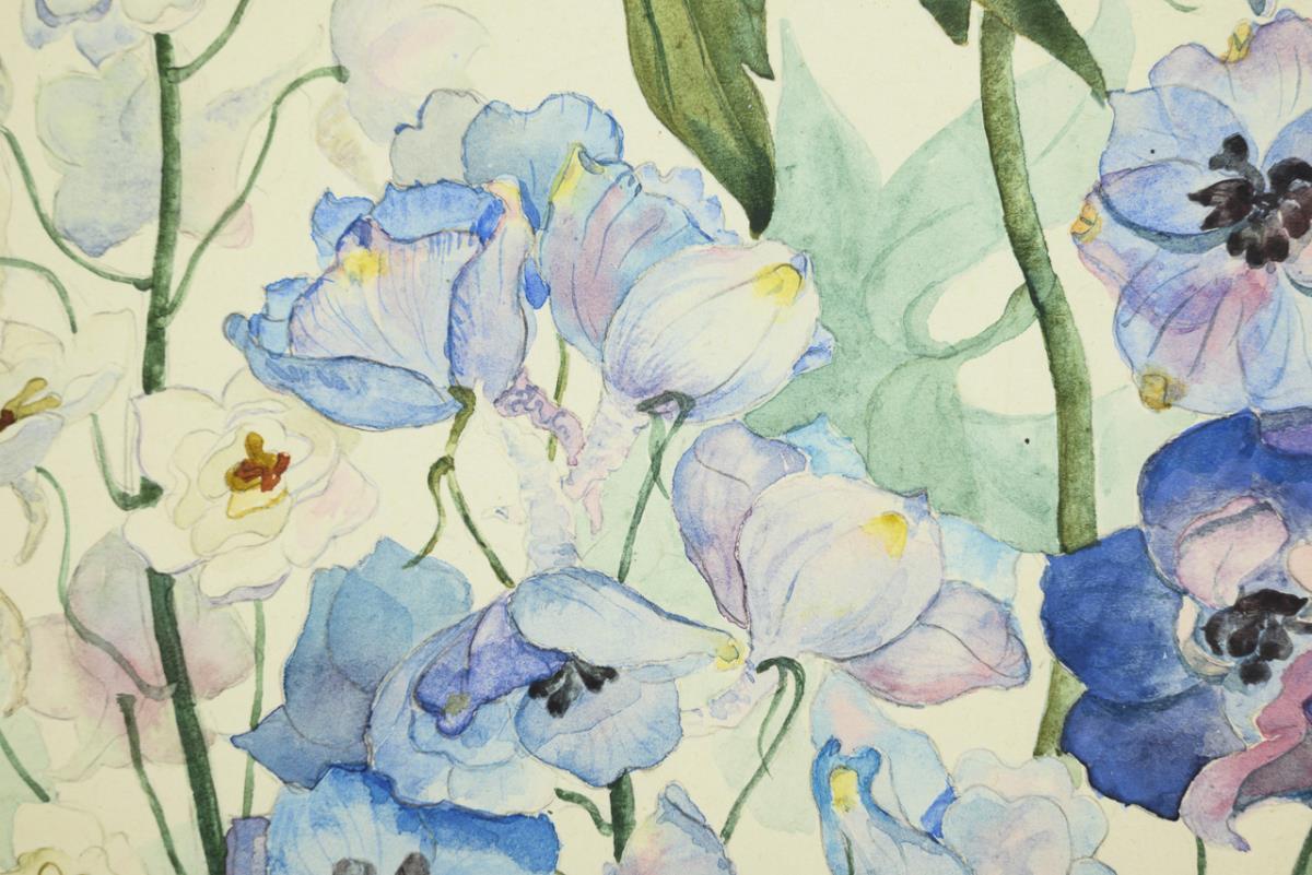 Detaillierte Studie der Pflanzen mit blauen und weißen Blüten.