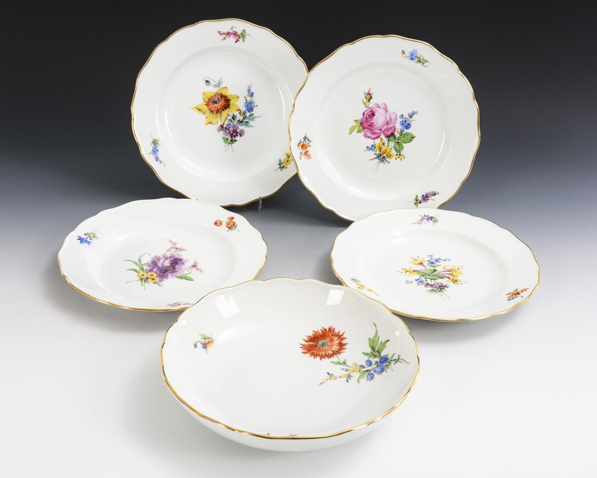 4 Teller und 1 Schale mit Blumenmalerei. Meissen.