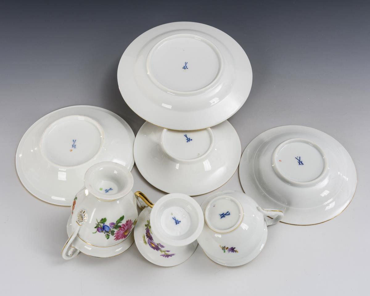 3 verschiedene Tassen und 1 Teller mit Blumenmalerei. Meissen.