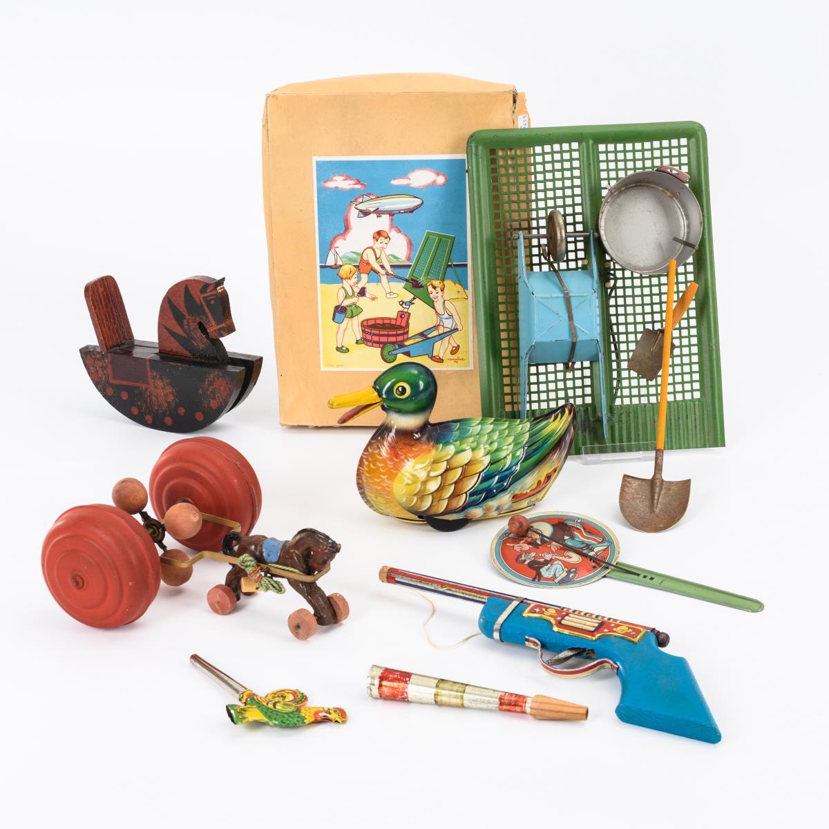 Mehrteiliges Sandspielzeug in Originalbox. / Massepferd mit rotem Rasselroller aus Blech. / Blechente mit Rollantrieb und Quakstimme./ 2 Blechtröten und 1 Blechklapper. / Knallkorken-Büchse. / Folkloristisches Schaukelpferd aus Holz. Bespielt, teils mit kleinen Defekten.