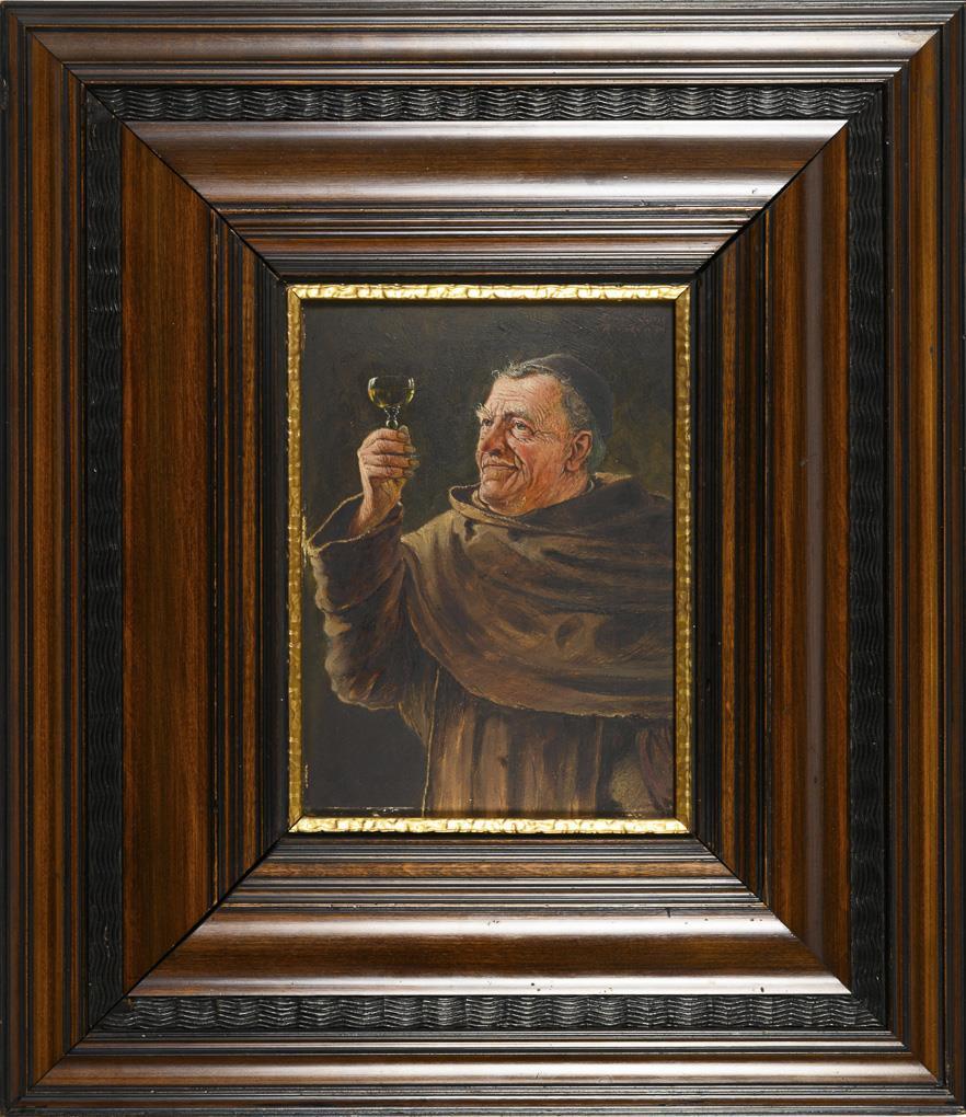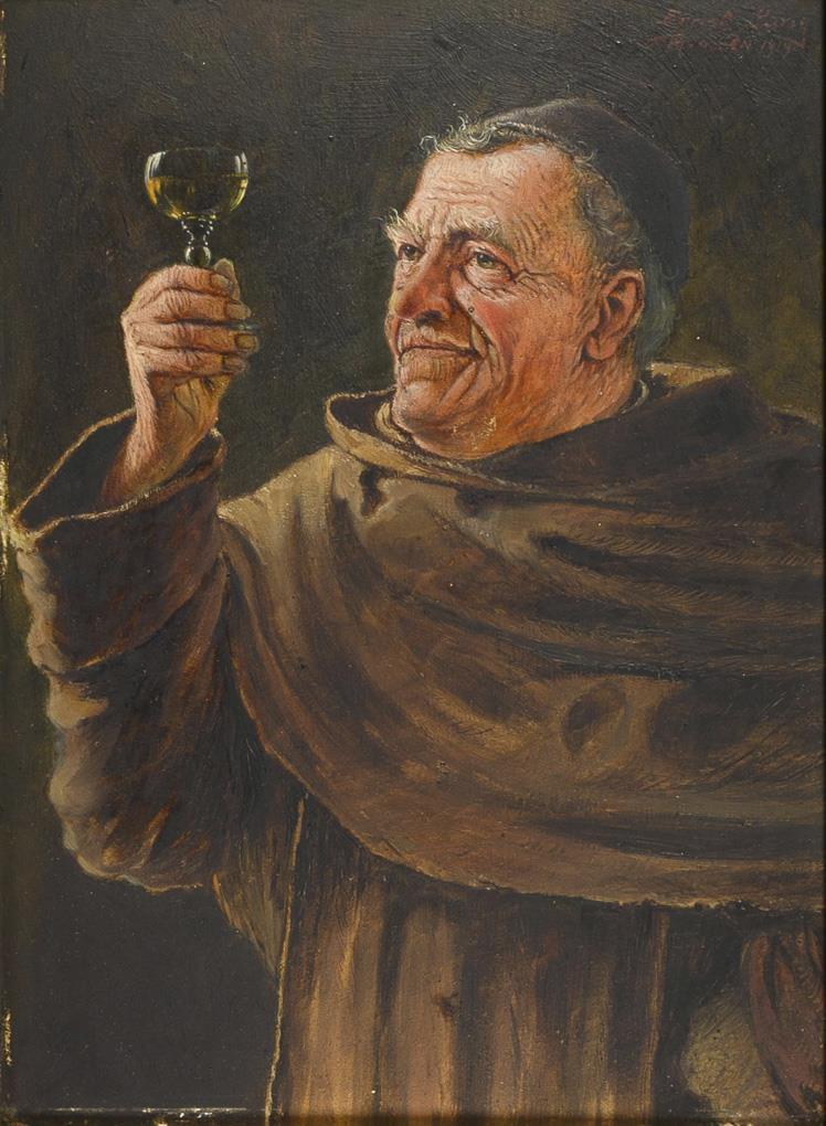 Ältere Mönch beim Begutachten des Weißweins. Altersspuren.