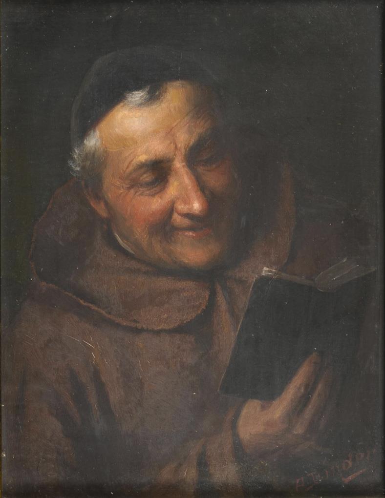 Freudig lesender, älterer Geistlicher mit einem kleinen Buch vor dunklem Hintergrund.