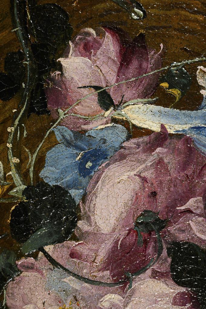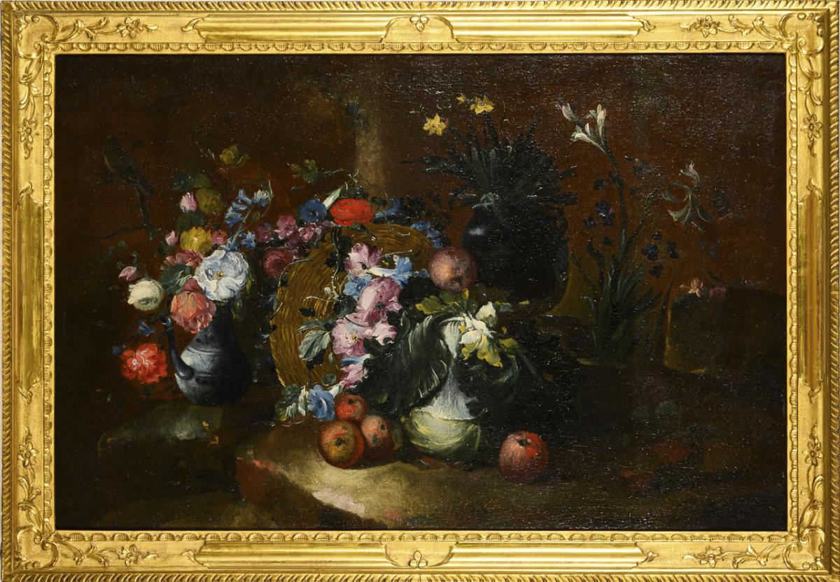 Anbei Expertise von Dario Succi, Auszug daraus: "Questo bellissimo dipinto [...] rientra certamente nell‘ambito di quel gruppo di decorazioni floreali che sono state attribuite a Francesco Guardi (Venezia 1712–1793) da autorevoli studiosi dell‘arte veneziana del Settecento, tra cui Giuseppe Fiocco, Rudolfo Pallucchini, Antonio Morassi, sulla base di argomentazioni stilistiche, come la leggerezza delle ariose composizioni costruite con pennellate, sfarfallanti, campite su fondi brunacei o grigio-azzurri e spesso arricchite da inserti di vasi cermici, uccelli, cesti di vimini e piatti inclinati posti su basi rocciose." ("Dieses wunderschöne Gemälde [...] ist sicher in die Gruppe der dekorativen Blumengemälde einzureihen, welche von den angesehensten Forschern zur Venezianischen Kunst des 18. Jahrhunderts, wie Giuseppe Fiocco, Rodolfo Pallucchini, Antonio Morassi, Francesco Guardi (Venedig 1712 - 1793) zugeordnet wurde."). Leinwand doubliert.