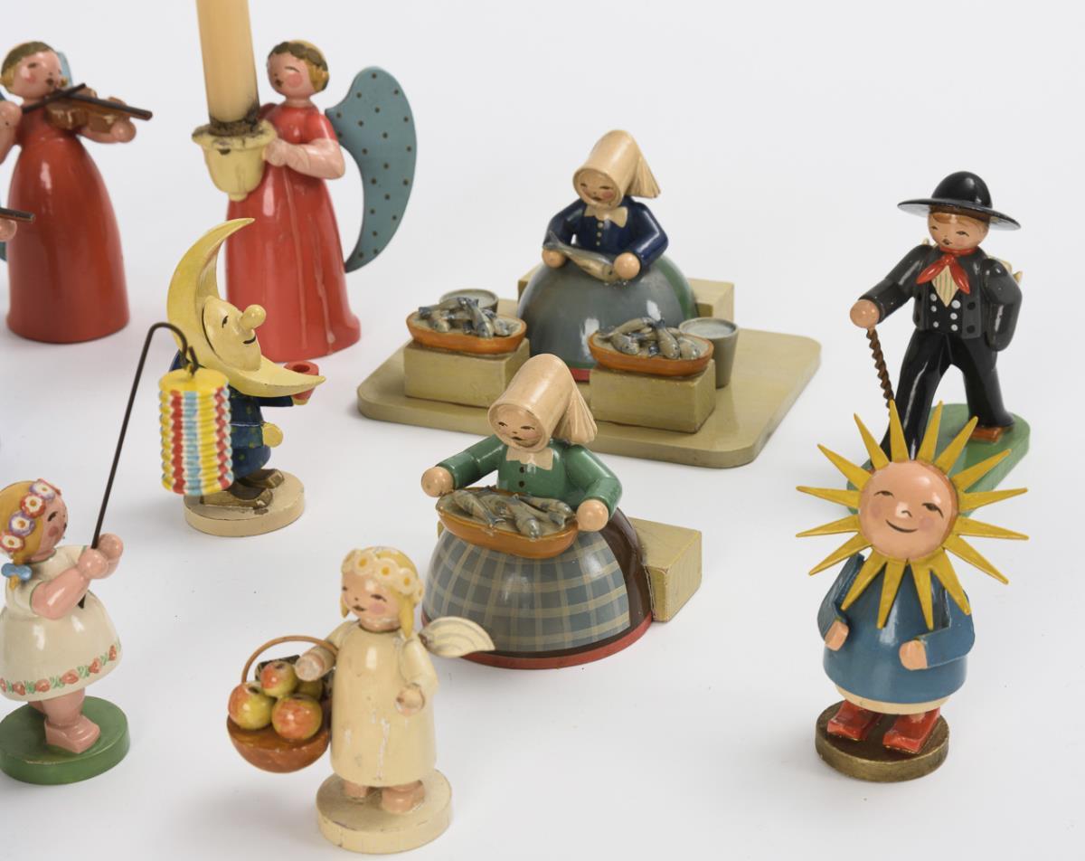 Verschiedene Holzfiguren, darunter Engel, Marktfrauen, Wanderbursche, Laternenkinder etc. Teils mit kleinen Defekten und Fehlstellen.