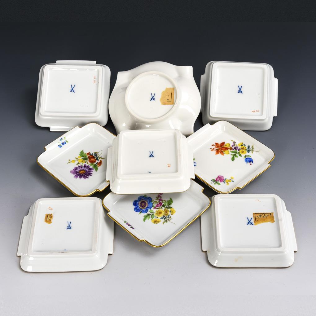 1 Ascher und 8 Untersetzer mit Blumenmalerei. Meissen.