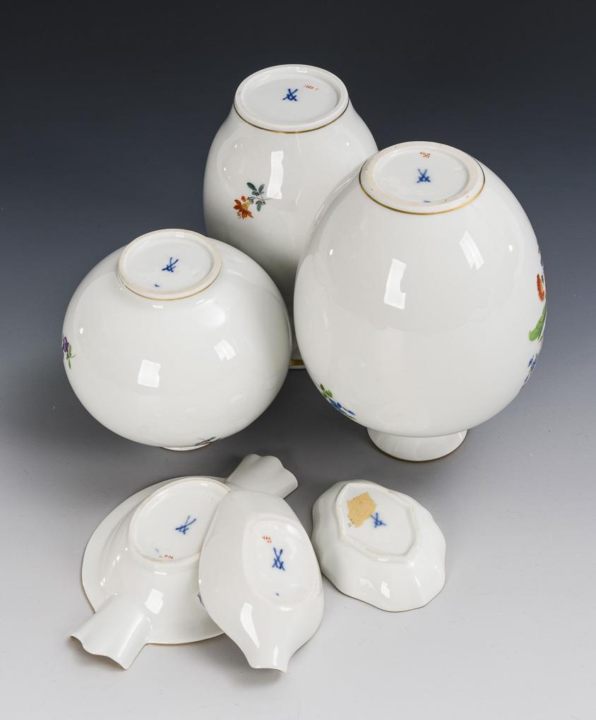 3 Vasen, 2 Ascher und 1 Schälchen mit Blumenmalerei. Meissen.
