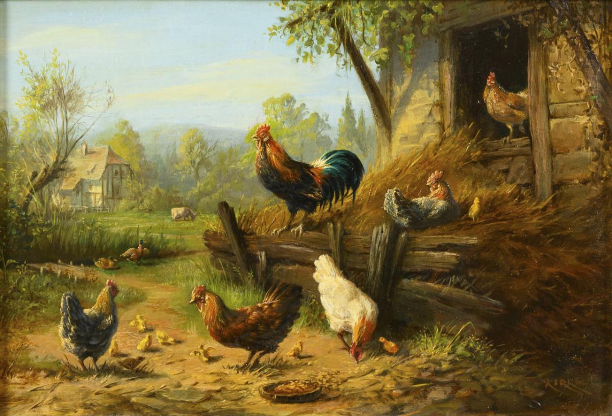 Die Hühner mit den Küken und dem wachenden Hahn vor dem Stall nahe dem Bauernhaus.