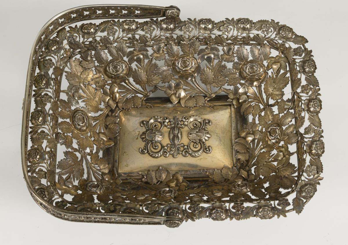 Duchbrochen gearbeiteter Korb mit Rosenreliefs und Bügelhenkel. Lötstellen am Fuß.