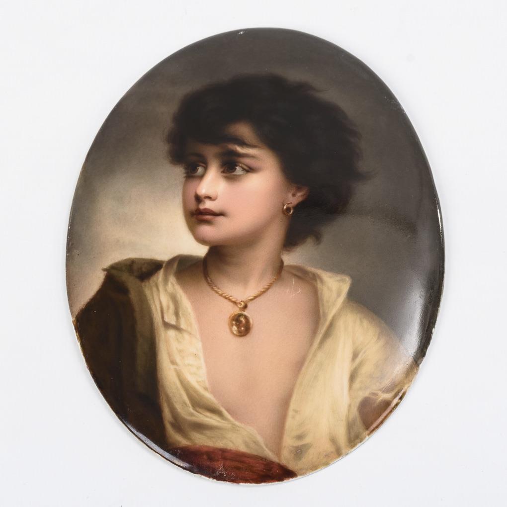 Ovale Bildplatte mit der Darstellung eines südländischen Knaben, nach einem Gemälde des Malers Gustav Karl Ludwig Richter (1823-1884). An der linken Schulter des Knaben Kratzspuren.