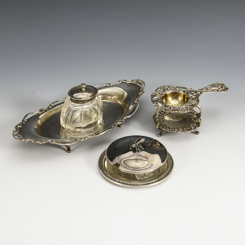 Englisches Tintenfass mit Silberdeckel, auf ovaler Unterschale, L 21,5 cm. / Reich reliefiertes Teesieb mit Halterung, H 4,5 cm. / Aus verschiedenen Teilen zusammengefügte Honigdose, bestehend aus: Silberteller, flacher Glasschale und Deckel mit plastischer Honigbiene als Knauf, H 4,5 cm. Gebrauchsspuren, Tintenzeug mit kleinen Dellen.