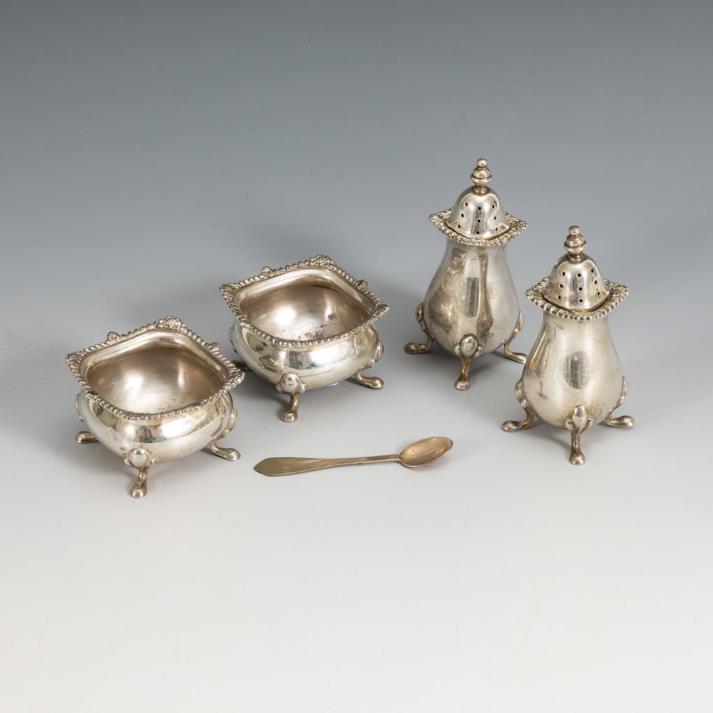 2 bauchige Streuer und 2 passende Quadratschälchen. Als Zugabe 1 Löffelchen. Kleine Dellen.