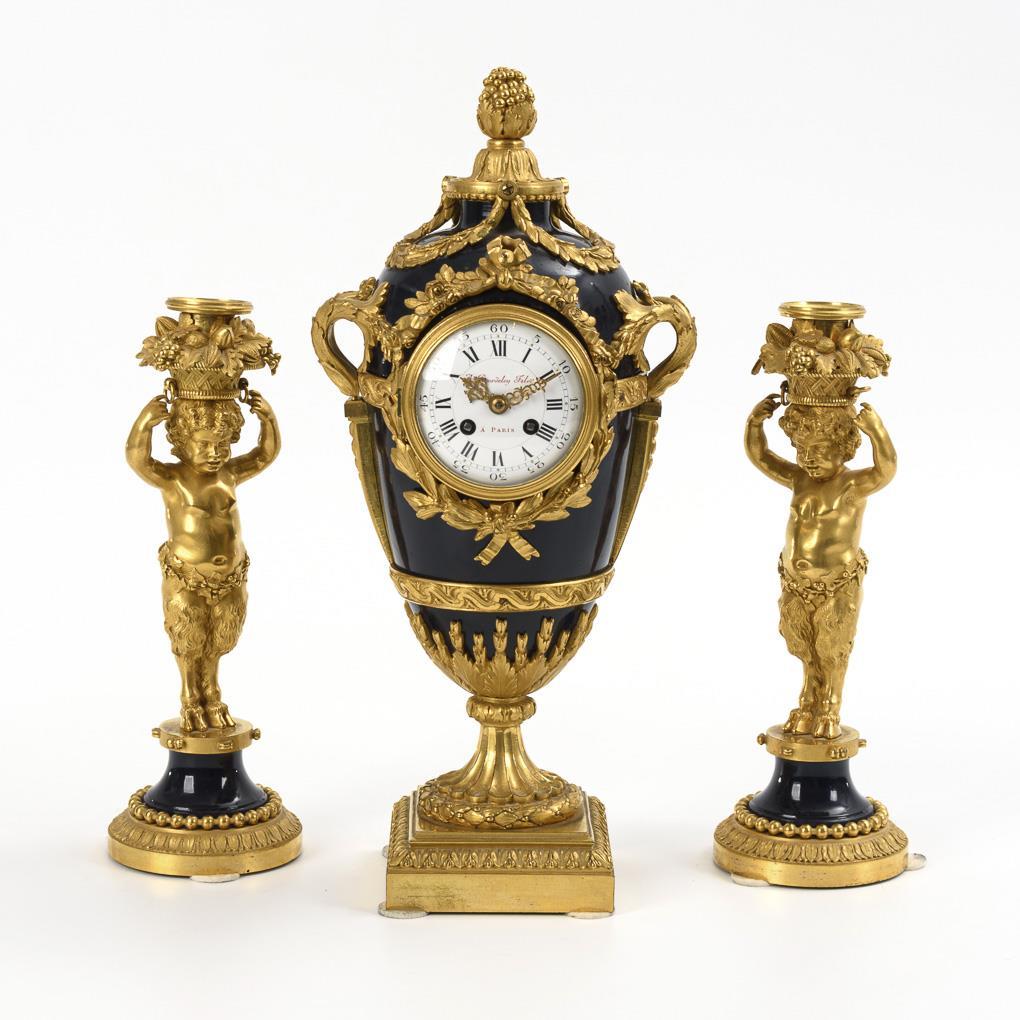 Bronze, feuervergoldet und kobaltblau patiniert. Uhr H 36 cm, 3,7 kg. Beisteller H 25,5 cm, je 1,4 kg.