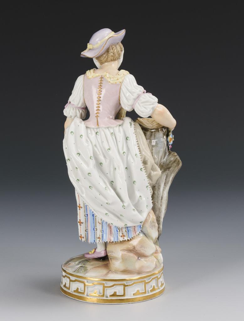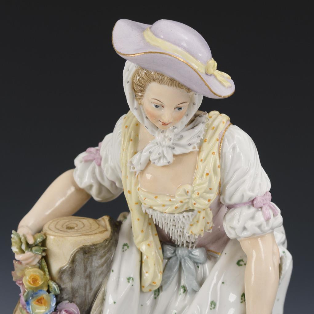 An einem Baumstumpf stehende Rokokogärtnerin mit Blumengirlande. Partiell Blüten und Blätter bestoßen.