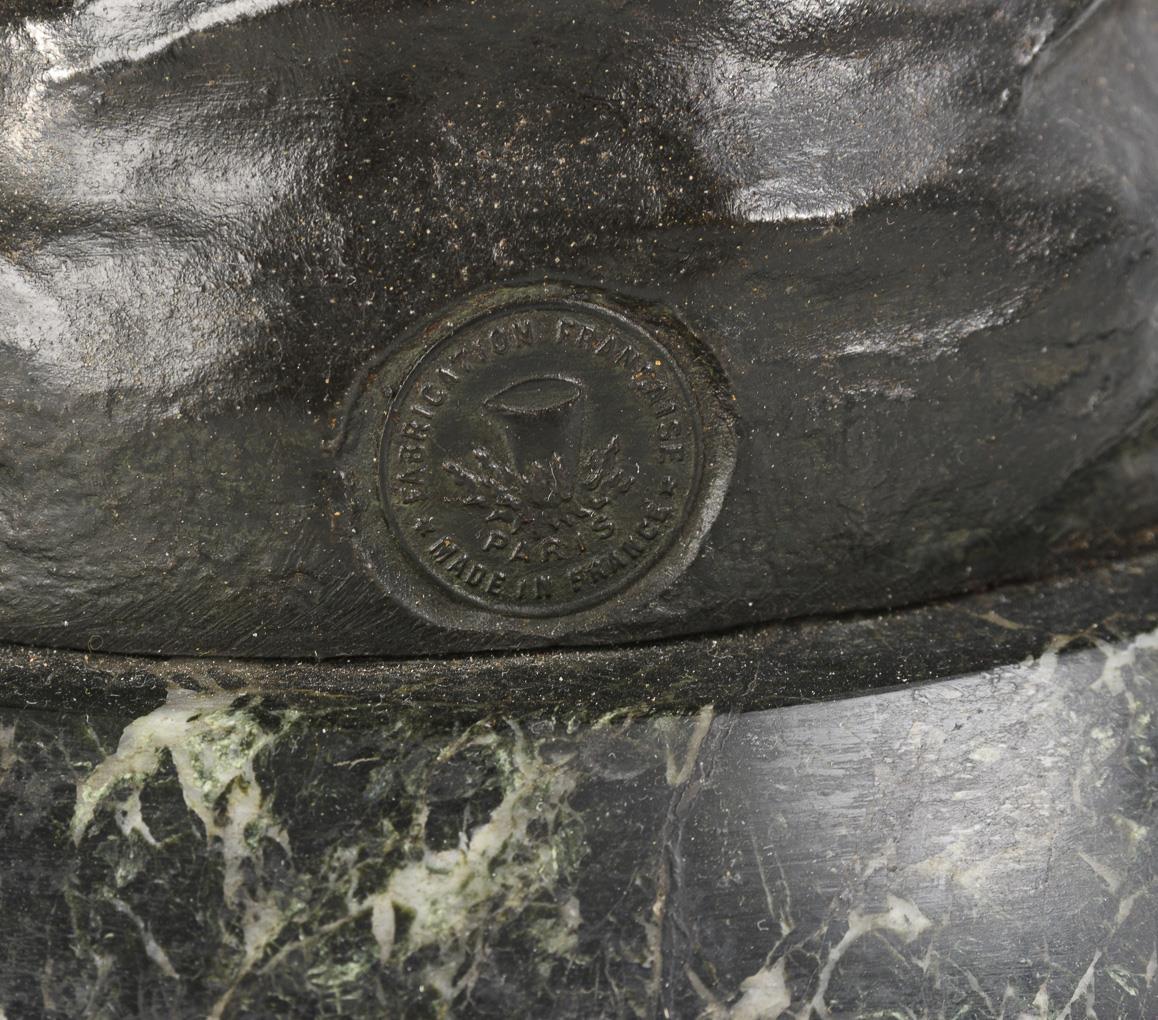 Metallguss (Régule), schwarz und bronzefarben patiniert, dunkle Marmor-Plinthe. Bezeichnet mit Zusatz "Salon des Beaux Arts 1888", Gießermarke "Fabrication Française, Paris, Made in France". H 49 cm, gesamt 51 x 38 x 23 cm. 10 kg.