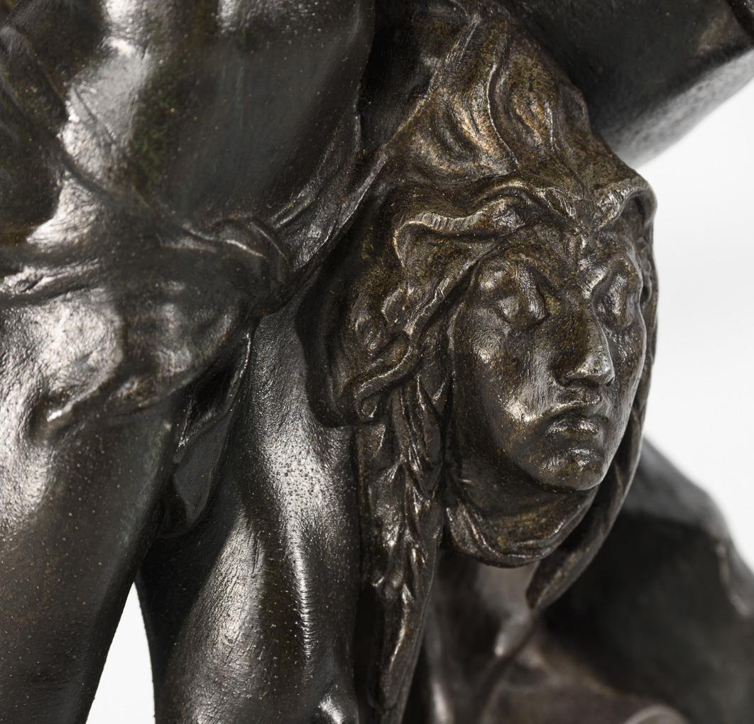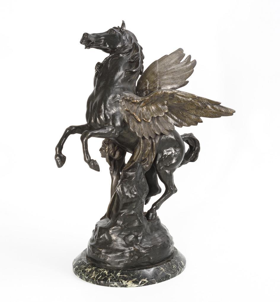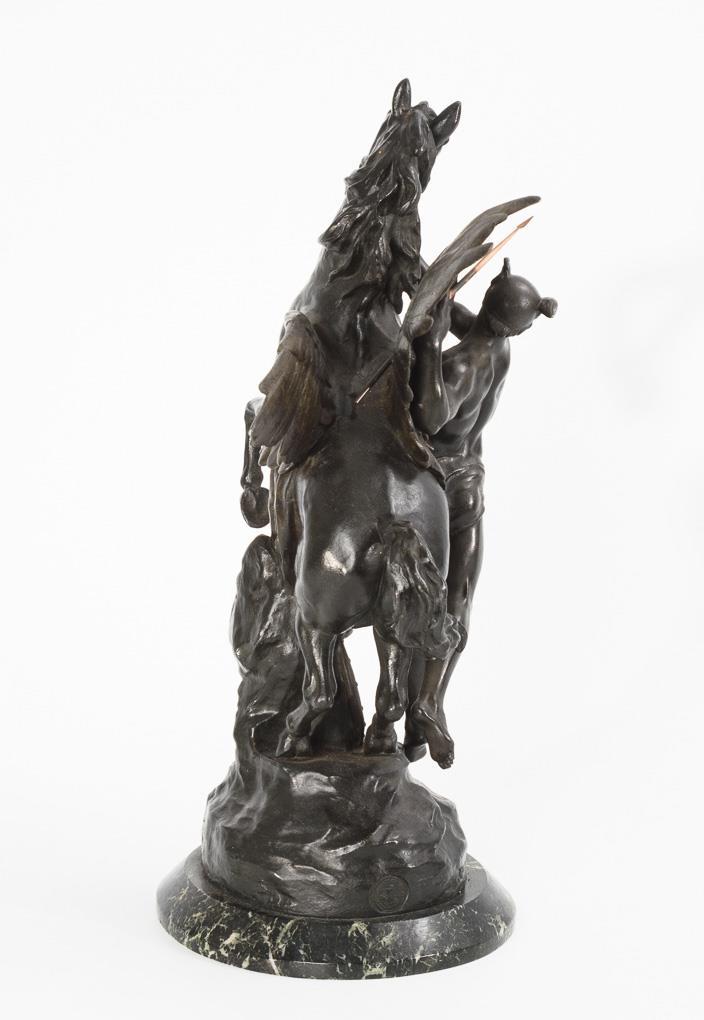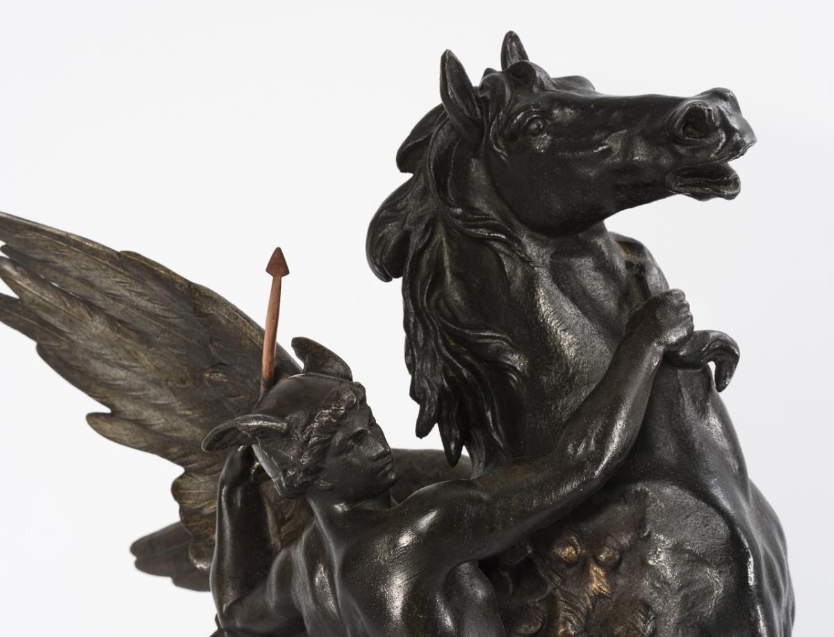 Der Held Perseus mit Flügelhut und dem Haupt der getöteten Gorga Medusa hält gleich einem Rossebändiger das geflügelte Pferd fest, das kraftvoll gen Himmel strebt. 1 Speerhälfte eventuell ergänzt.