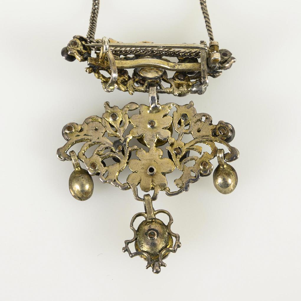 Silber geprüft. Wohl Deutschland. Brosche 5 x 3,8 cm. Kette L 45 cm. 19,3 g.