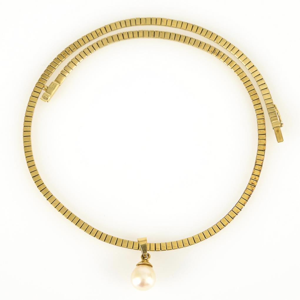 An gravierter Gliederkette, Anhänger mit tropfenförmiger Zuchtperle. Kastenschloss mit Achtersicherung.