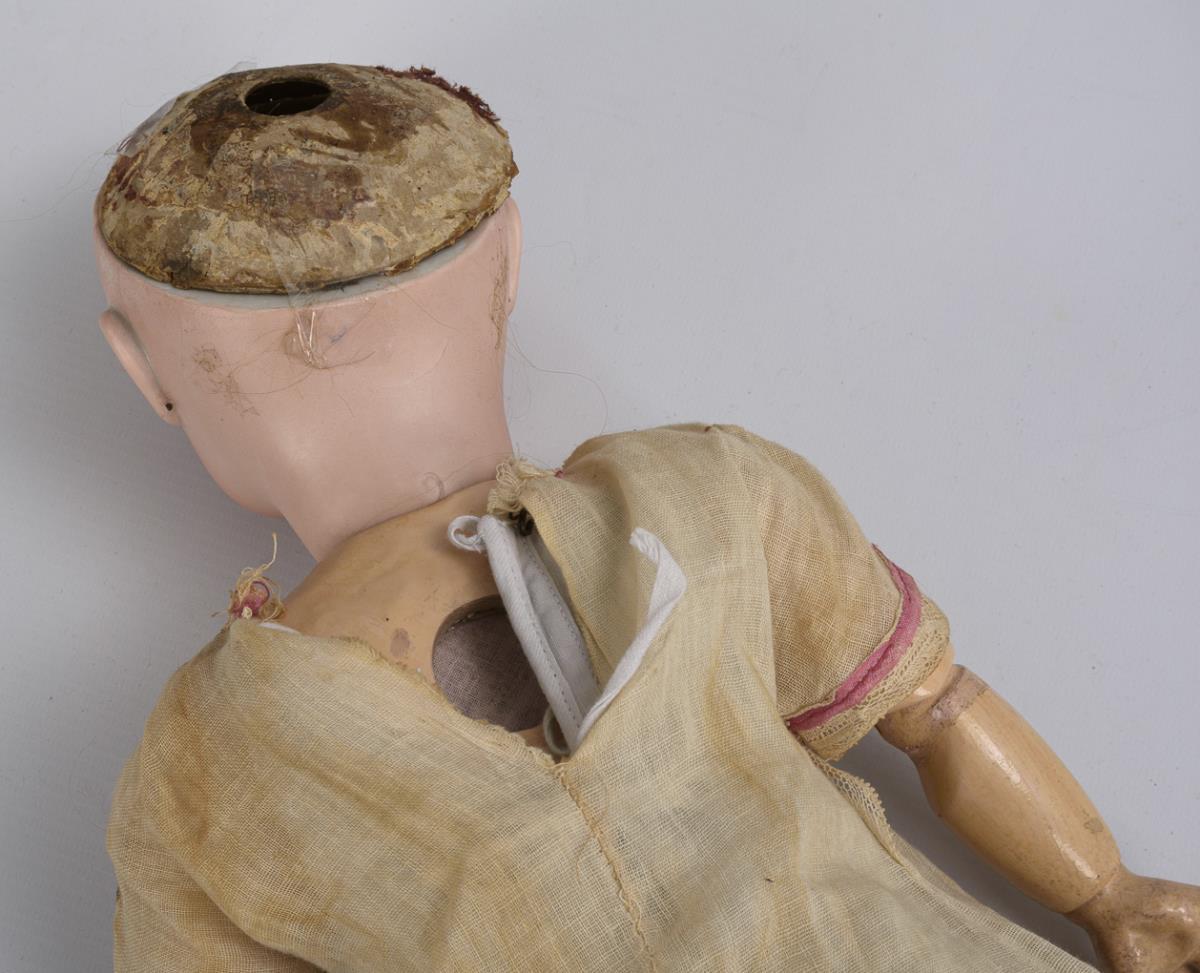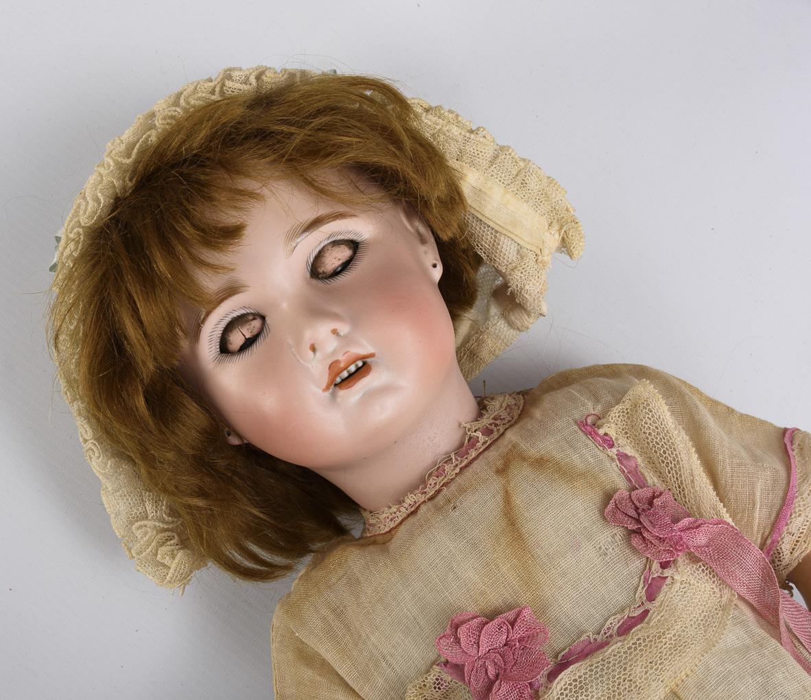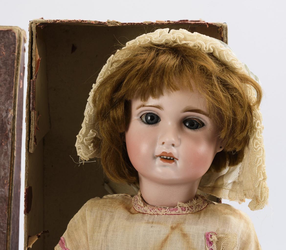 Kurbelkopf, blaue Schlafaugen (leicht eingefallen), jünger ergänzte Mohairperücke. 11-teiliger Gliederkörper. Original bekleidet mit hellem Kleidchen, Haube, braunen Schuhen. Dazu rosa Stoffhase. Originaler Karton mit Altersspuren und Defekten. 2 kurze Brandrisse an der Kopfkrone, kleiner Haarriss über dem linken Ohr. Hände mit Farbdefekten, Zugstimme defekt.