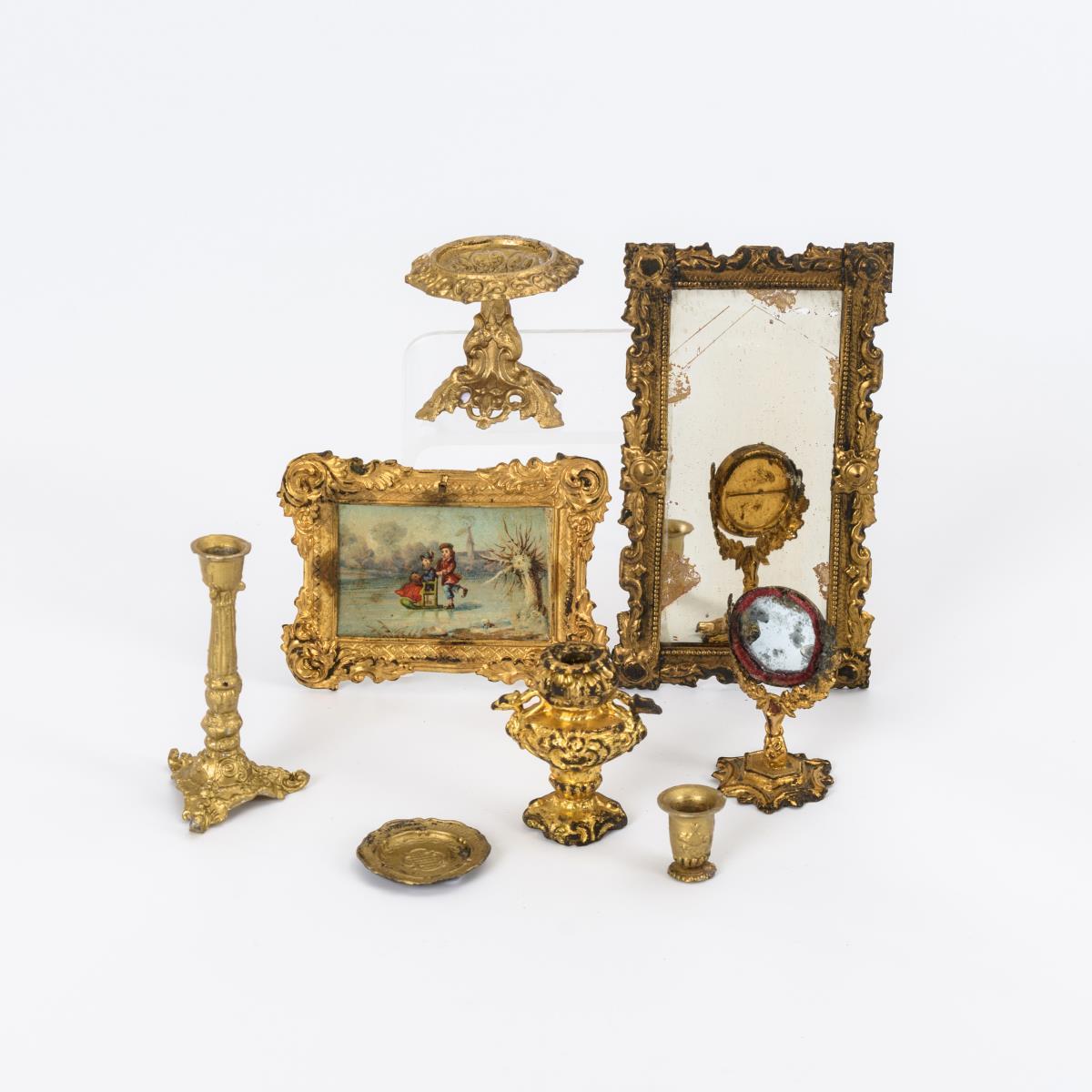 Wandspiegel und Bilderrahmen aus geprägtem Blech, Tischspiegel, Schale, Vase, Leuchter, Teller und Becher. Altersspuren, Spiegelglas teils blind.
