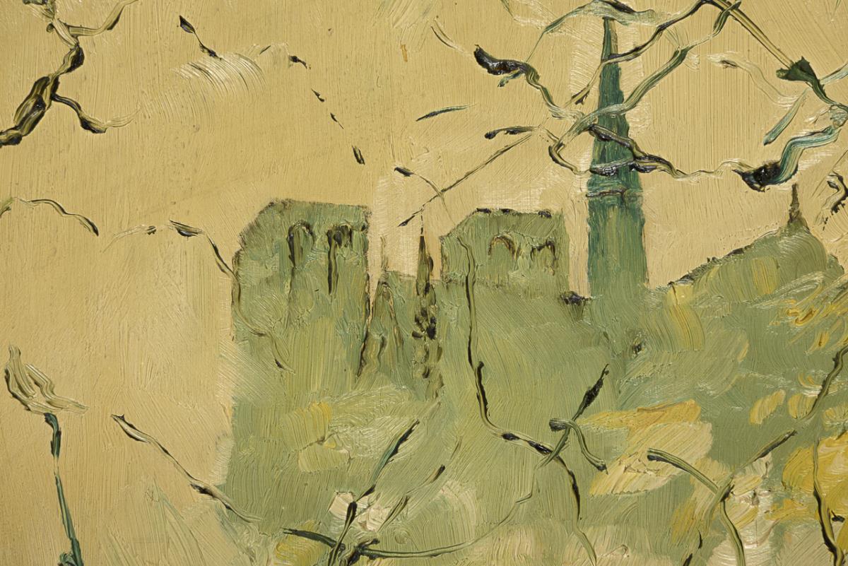 Blick über die Seine zur Kathedrale im Dunst und fahlen Licht.