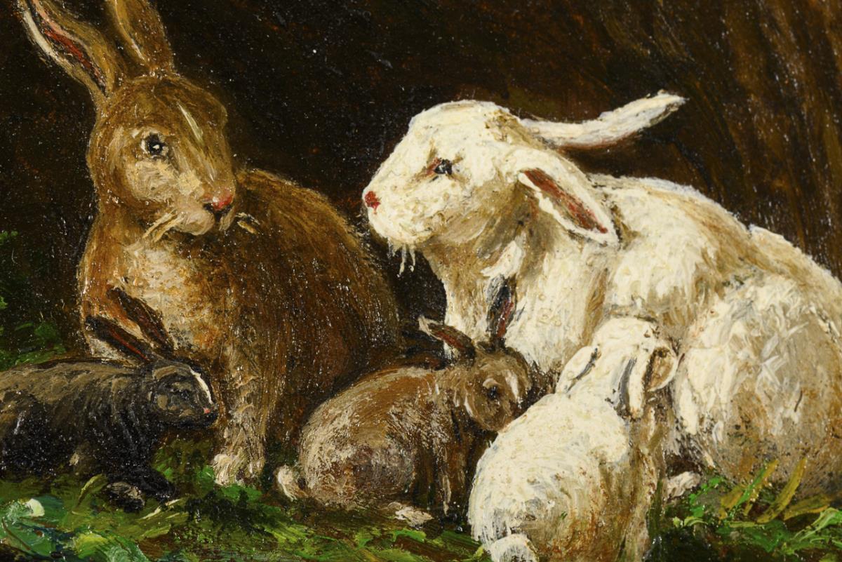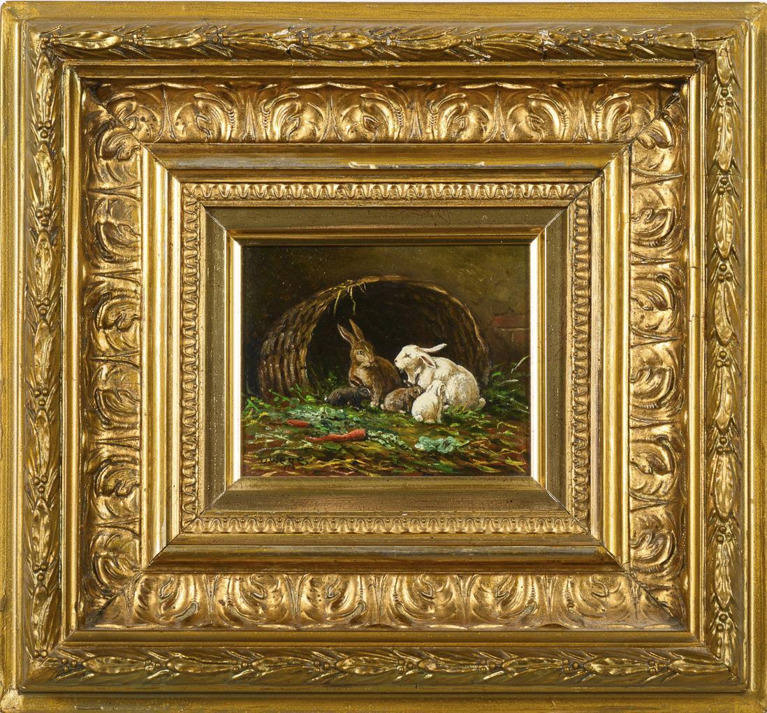 Hasenfamilie an einem Weidenkorb mit Möhren und Salat.