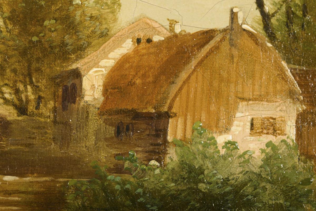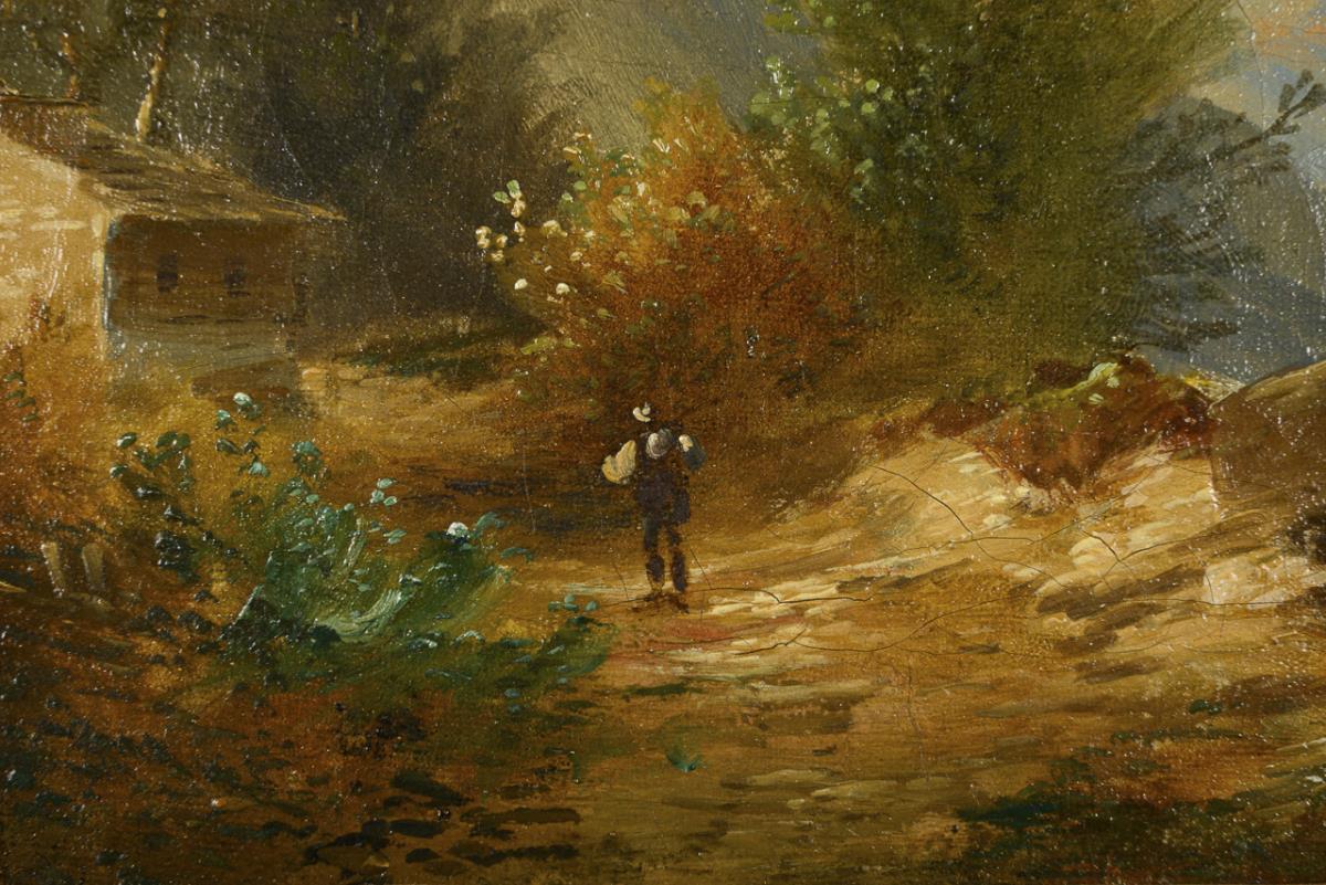 Dorflandschaft an einem Fluss im Sonnenschein bzw. Berghütte mit Staffagefigur an einem sommerlichen Tag. Eine restaurierte Stelle mit Hinterklebung.