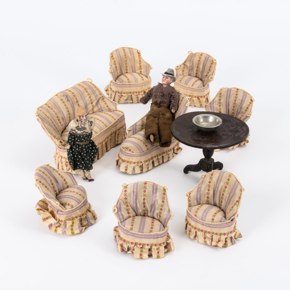 Sofa, Recamiere, 6 Sessel, runder Tisch mit Golddruck, Zinnschale. Dazu 2 Puppenstubenpüppchen. Altersspuren, Püppchen mit starken Defekten.
