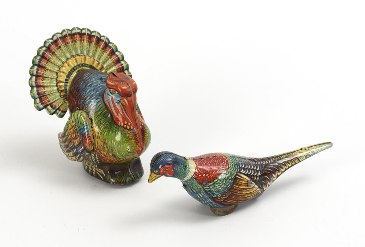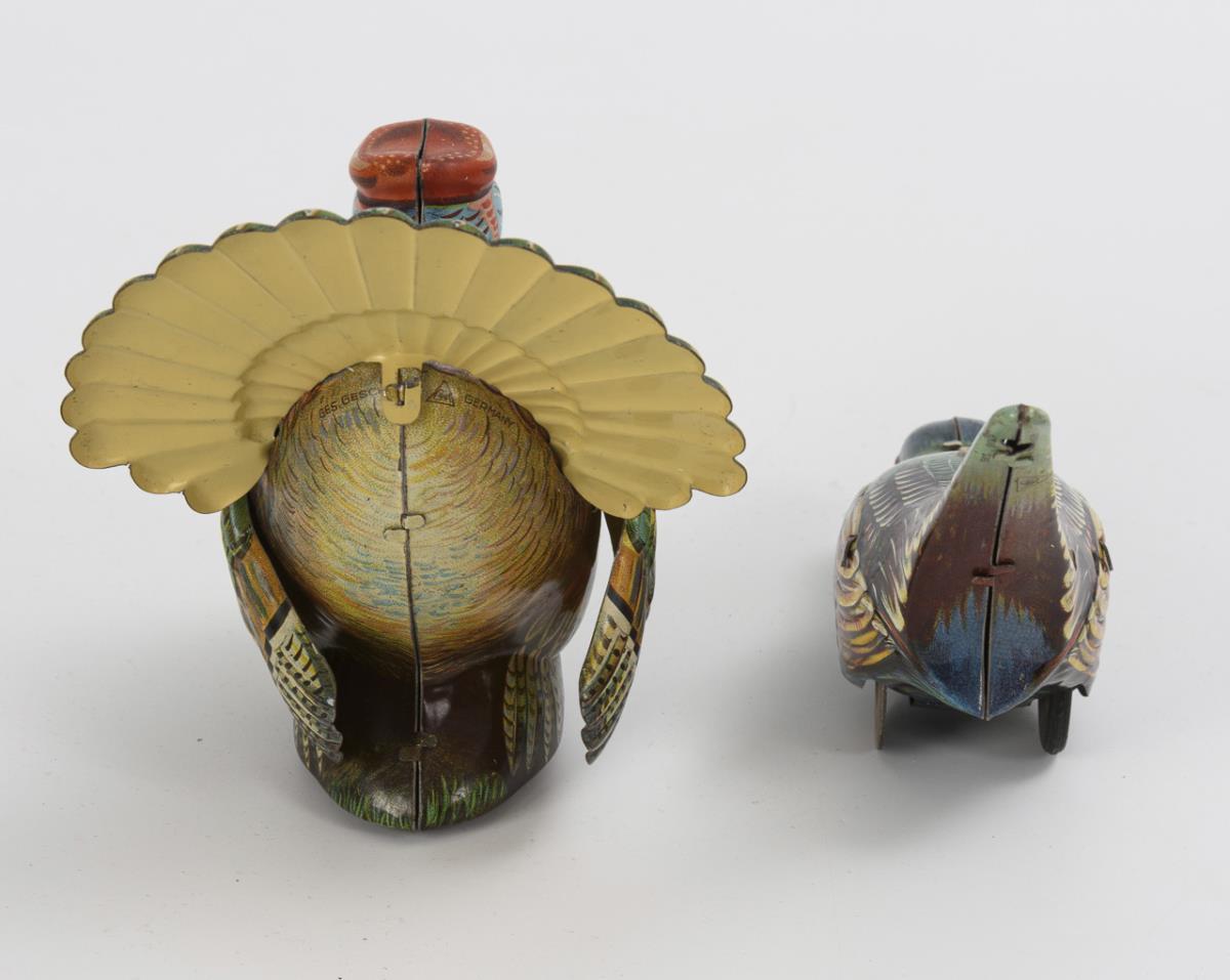 Truthahn (H 11 cm) im Originalkarton "Made in Western Germany" und Fasan (H 6 cm). Beide mit intaktem Werk. Dazu 1 Schlüssel. Karton geklebt, mit Defekten.