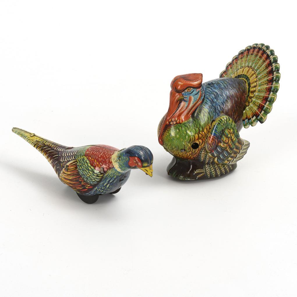 Truthahn (H 11 cm) im Originalkarton "Made in Western Germany" und Fasan (H 6 cm). Beide mit intaktem Werk. Dazu 1 Schlüssel. Karton geklebt, mit Defekten.