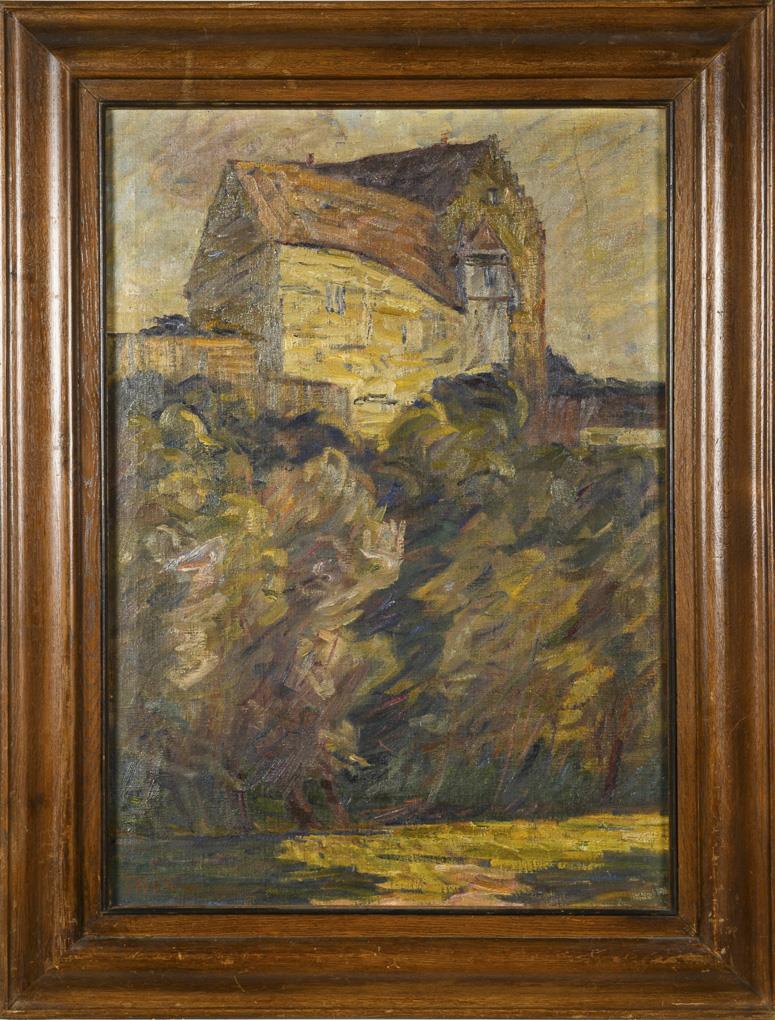 Undeutlich signiert: Schlossansicht über Flusslauf