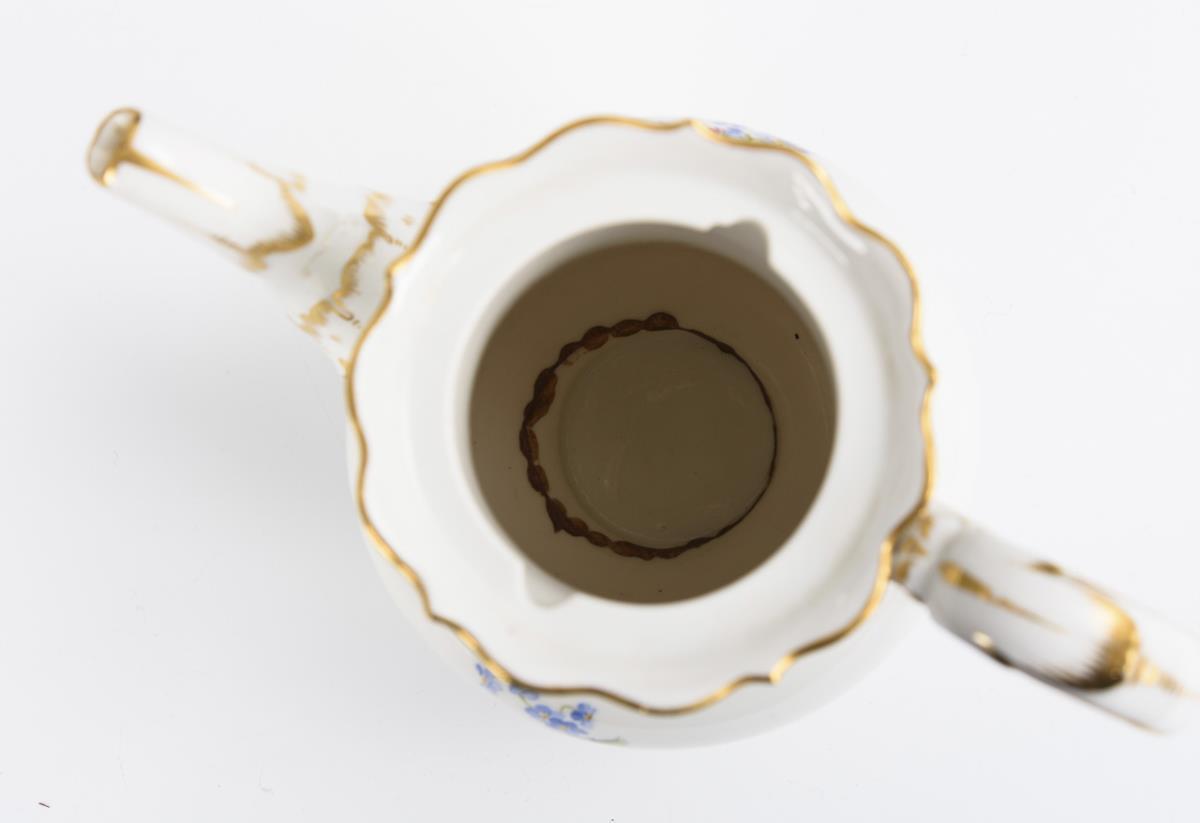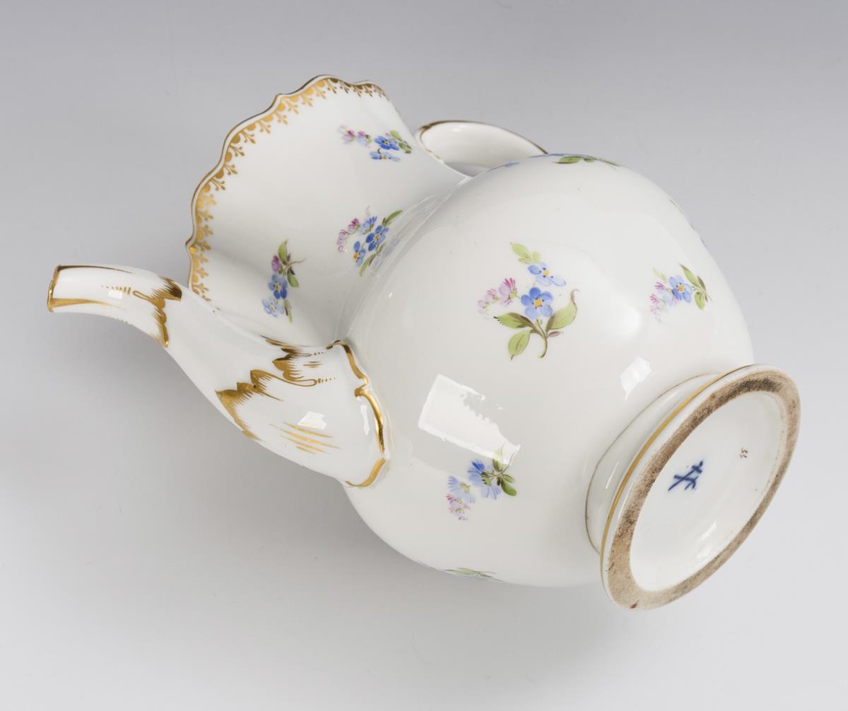 8 Teile. Form "Neuer Ausschnitt". Kaffeekanne (H 19 cm), Milchkännchen, Zuckerdose, Gedeck (Tasse, Untertasse und Kuchenteller) und rechteckiges Tablett (31 x 37 cm). Als Zugabe 1 Kuchenteller. Rosenknäufe bestoßen, Bestoßung am Innenrand der Kaffeekanne, Kannenstand defekt und alt repariert.