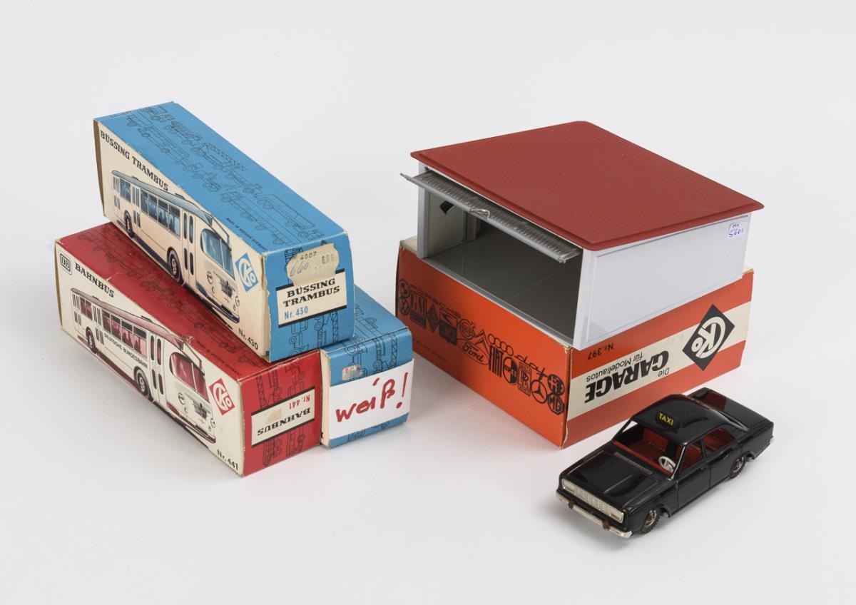 2x Büssing Trambus Nr. 430 (1x weiß, 1x blau), 1x roter Bahnbus Nr. 441, 1x schwarzes Taxi Nr. 416 und Garage Nr. 397. Alle Fahrzeuge mit intaktem Friktionsantrieb. Taxi ohne OVP.