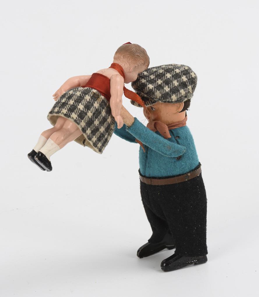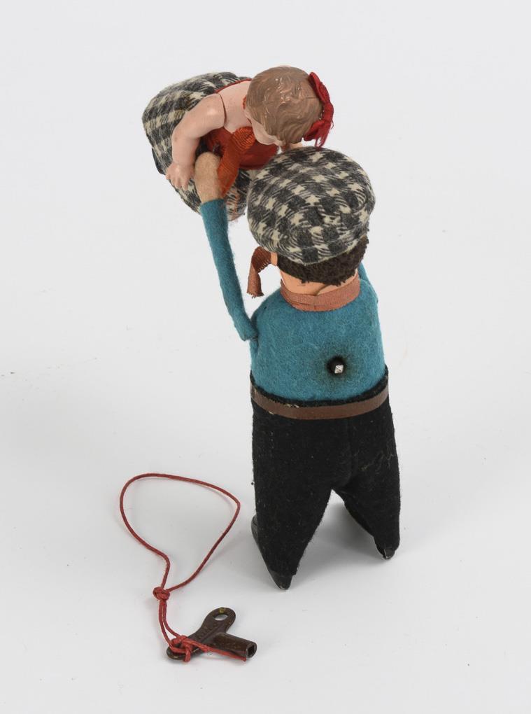 Gauner mit Schiebermütze und Celluloid-Mädchen (No. 977). Werk intakt, mit Schlüssel. Läuft. Mädchen mit Delle am Bein.