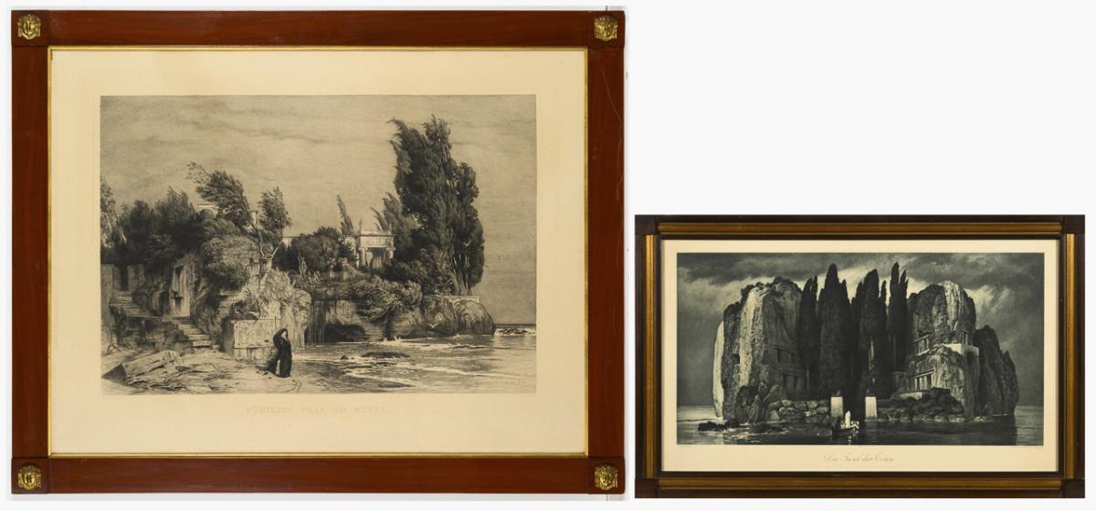 Reproduktionen nach den Gemälden "Römische Villa am Meere", Heliogravure, Abbildung: 47,5 x 69 cm, gerahmt und hinter Glas: 77 x 97,5 cm, etwas stockfleckig | "Die Insel der Toten", Lichtdruck, Abbildung: 28 x 52,5 cm, gerahmt & hinter Glas: 41 x 64 cm, etwas lichtgebräunt.