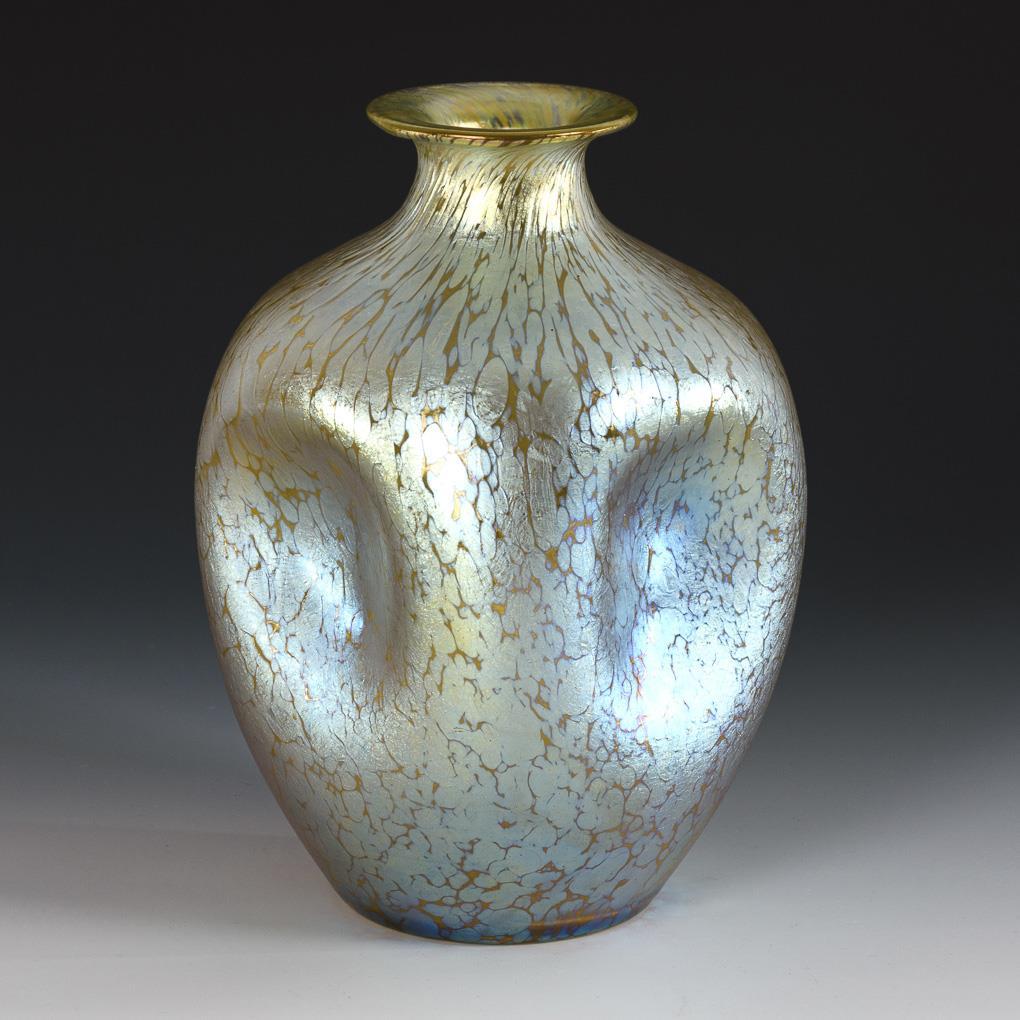 Farbloses Glas mit silbergelben Kröselaufschmelzungen, irisiert. H 23,5 cm.