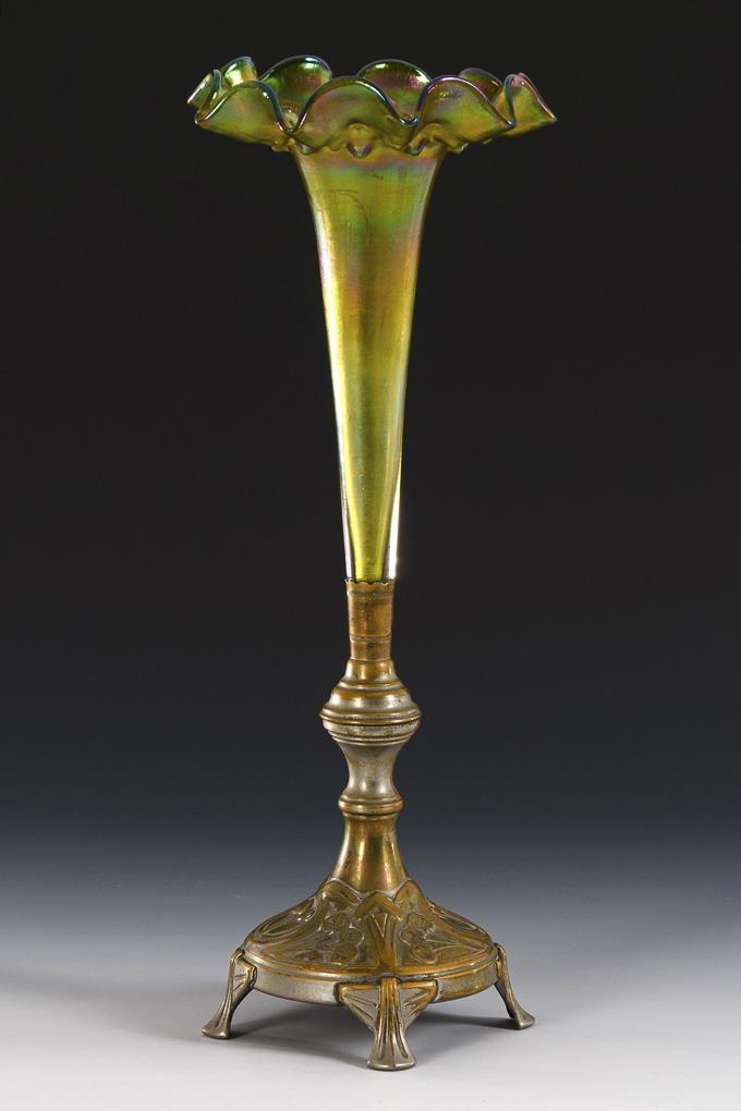 Trichtervase mit gewelltem Rand und kleinen Noppen am Mündungsrand, Metallschaft mit floral reliefiertem Rundfuß und vier Füßen.