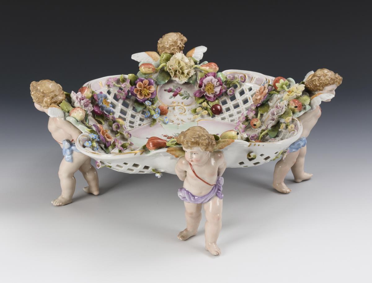 Von vier Putten getragene, achtpassige Schale mit Gitterdurchbruch und reichem Blüten- und Fruchtbelag. Minimale Bestoßungen am Belag, 1 Flügel geklebt.