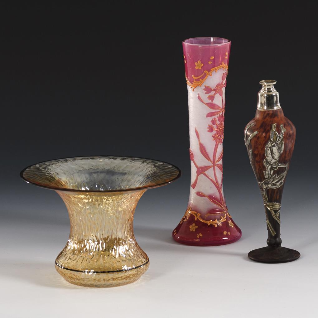 1x um 1900: Kratervase aus farblosem, marteléoptisch geblasenem, irisierten Glas (H 10,5 cm). / 1x um 1900/20: Stangenvase aus farblosem Glas mit opalweißem Innenfang und rosa Überfang, geätztem Blumendekor und orangener Reliefemailmalerei (H 20,5 cm). / 1x Verreries d'Art Lorrain, signiert, 1926/27: Keulenvase aus farblosem Glas mit brauner und oranger Pulvereinschmelzung, floraler Silberauflage und metallmontiertem Rand mit Schraubverschluss (Verschluss fehlt; H 18 cm).