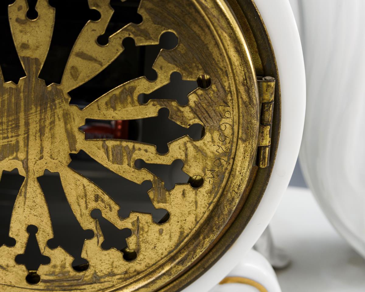 Auf ovalem Sockel ruhende, von zwei Füllhörnern flankierte Uhr. Jünger ergänztes Quarzuhrwerk.