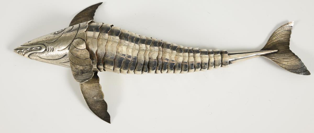 In Art einer Besamimbüchse gestalteter Fisch. Rückenflosse mit Lötstellen.