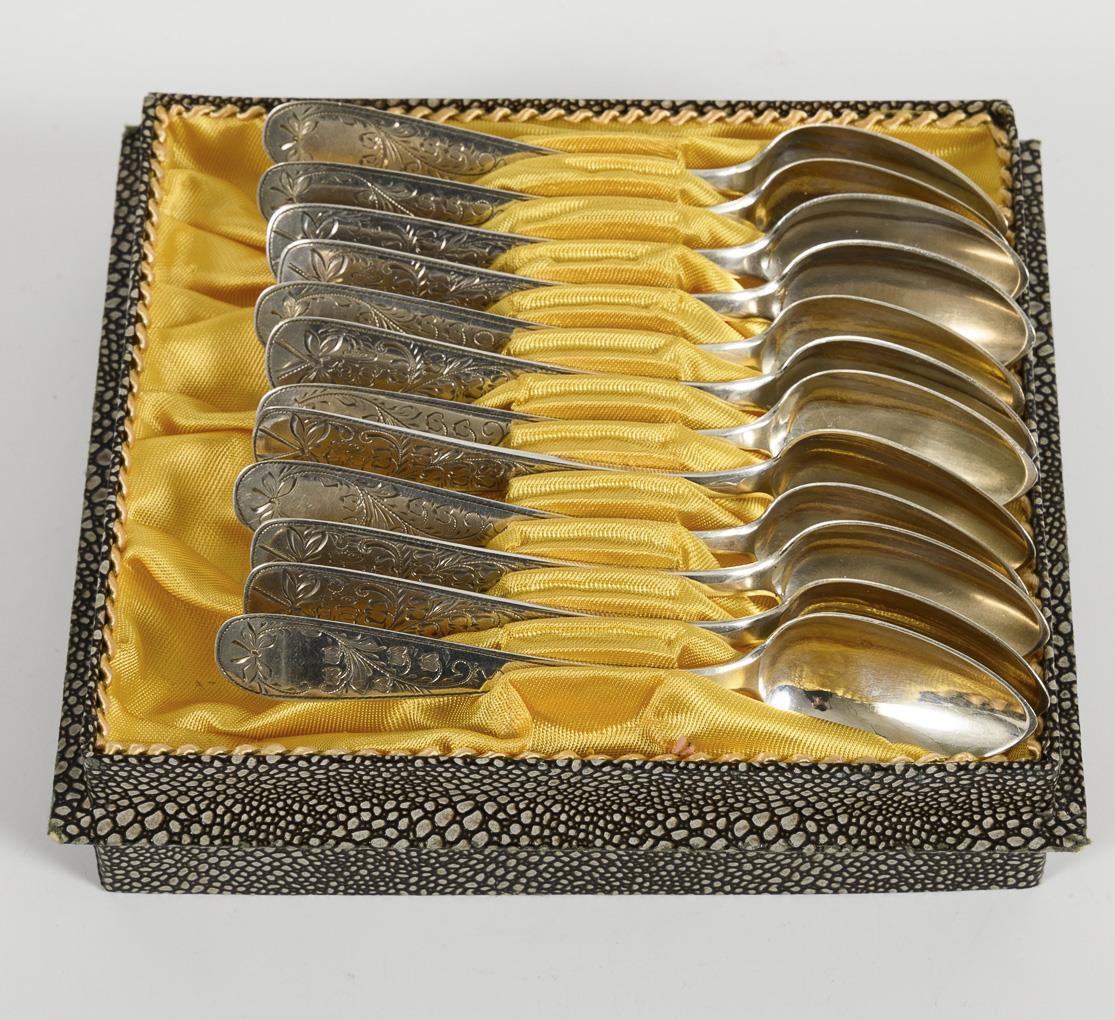 Je 6 gravierte Löffelchen, jeweils mit rückseitiger Monogrammgravur. In Etui mit Schlangenhautmuster.