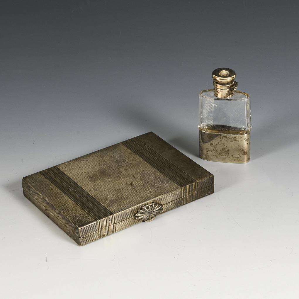 Gerillte Schatulle mit Spiegel und 3 kleinen Fächern innen (1,5 x 14 x 10 cm). Flachmann mit Silbermontierung (H 9 cm). Gebrauchsspuren, Glas mit Randbestoßung, Spiegel mit kleiner Blindstelle.