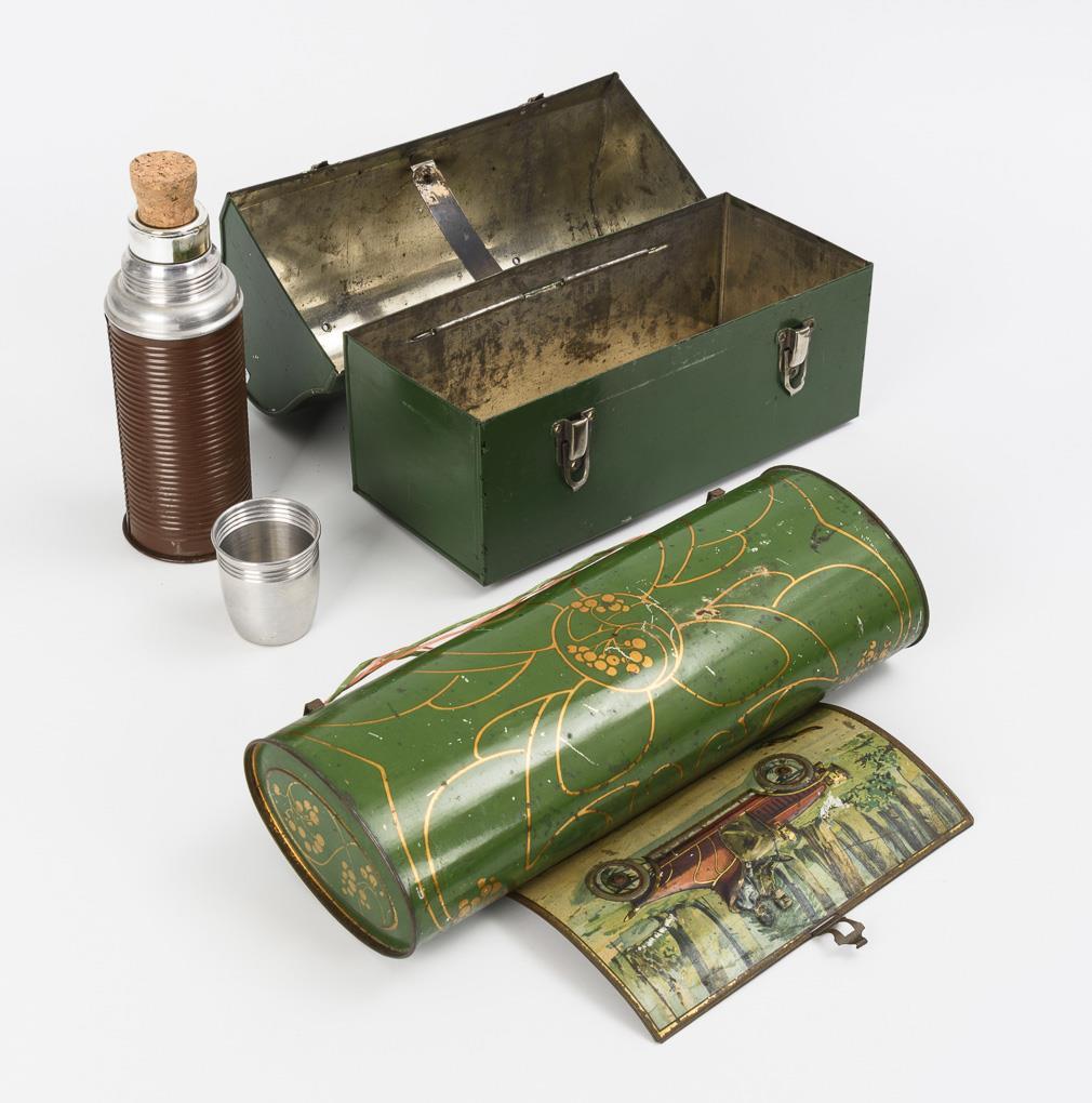 Farbig lithografierte Botanisierbüchse mit Auto-Motiv und provisorisch ergänztem Griff. / Kleiner Picknickkoffer mit Isolierkanne "Helios Perfekt". Altersspuren, Lackdefekte.