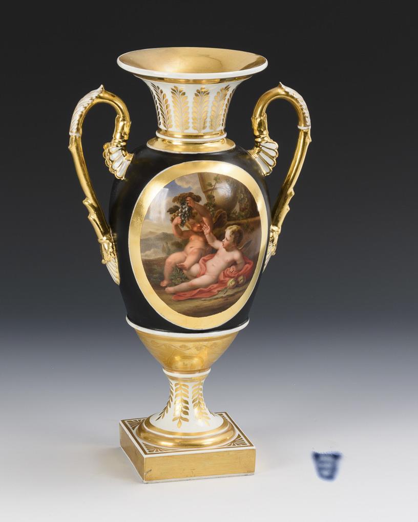 Ovoider Korpus mit zwei Palmettenhenkeln, Kraterhals und Rundfuß, auf Quadrathplinthe. Schwarzer Fond, beidseitig eine ovoide Kartusche mit der fein gemalten Darstellung eines in einer Landschaft lagernden Puttenpaares mit Trauben und Äpfeln bzw. eines Bacchanten mit Panflöte, einer Elfe und eines Ziegenbockes. Korpus, Henkel und Fuß restauriert.