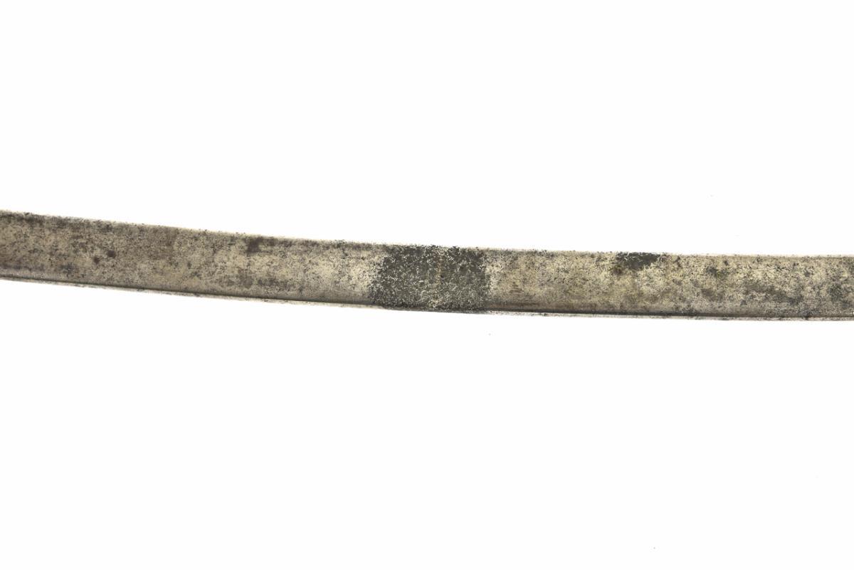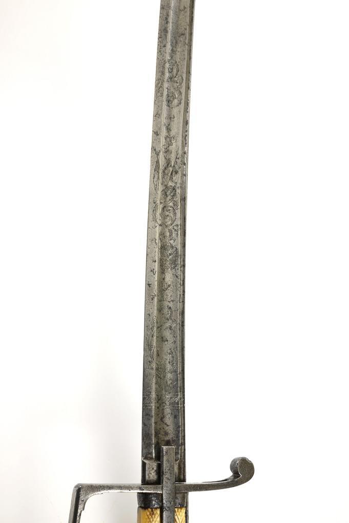 Leicht gebogene Klinge mit verstärkter Rückenlinie, breitem Hohlschliff, der sich zur Pandurenspitze hin in zwei schmale Hohlschliffe teilt. Florale Gravuren auf beiden Seiten. Eisengefäß und Griff aus Bein (Trockenrisse). Metallscheide mit zwei Bandringen. Scheide mit Korrosionsnarben.