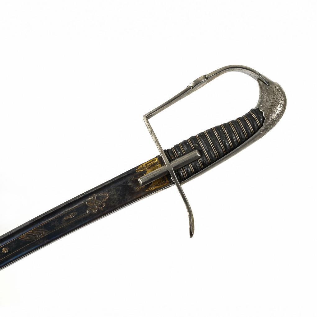 Stark gebogene, einschneidige Klinge mit Pandurenspitze, verstärktem Rücken und zwei schmalen Hohlschliffen. Unteres Drittel gebläut und graviert, teils vergoldet. Gefäß aus Eisen mit Vogelkopfknauf und Oval im flachen Bügel. Ledergriff mit gedrilltem Draht. Metallscheide auf einer Seite glatt, auf der anderen Seite dreifach kanneliert. Zwei bewegliche Ringe. Scheide mit Korrosionsnarben.