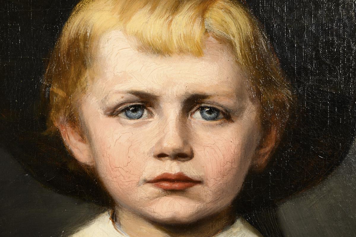 Porträt eines Jungen in dunkler Kleidung mit Hut neben seiner Schwester im roten Kleid auf einem Armlehnstuhl. Zwei kleine restaurierte Stellen mit Hinterklebungen.