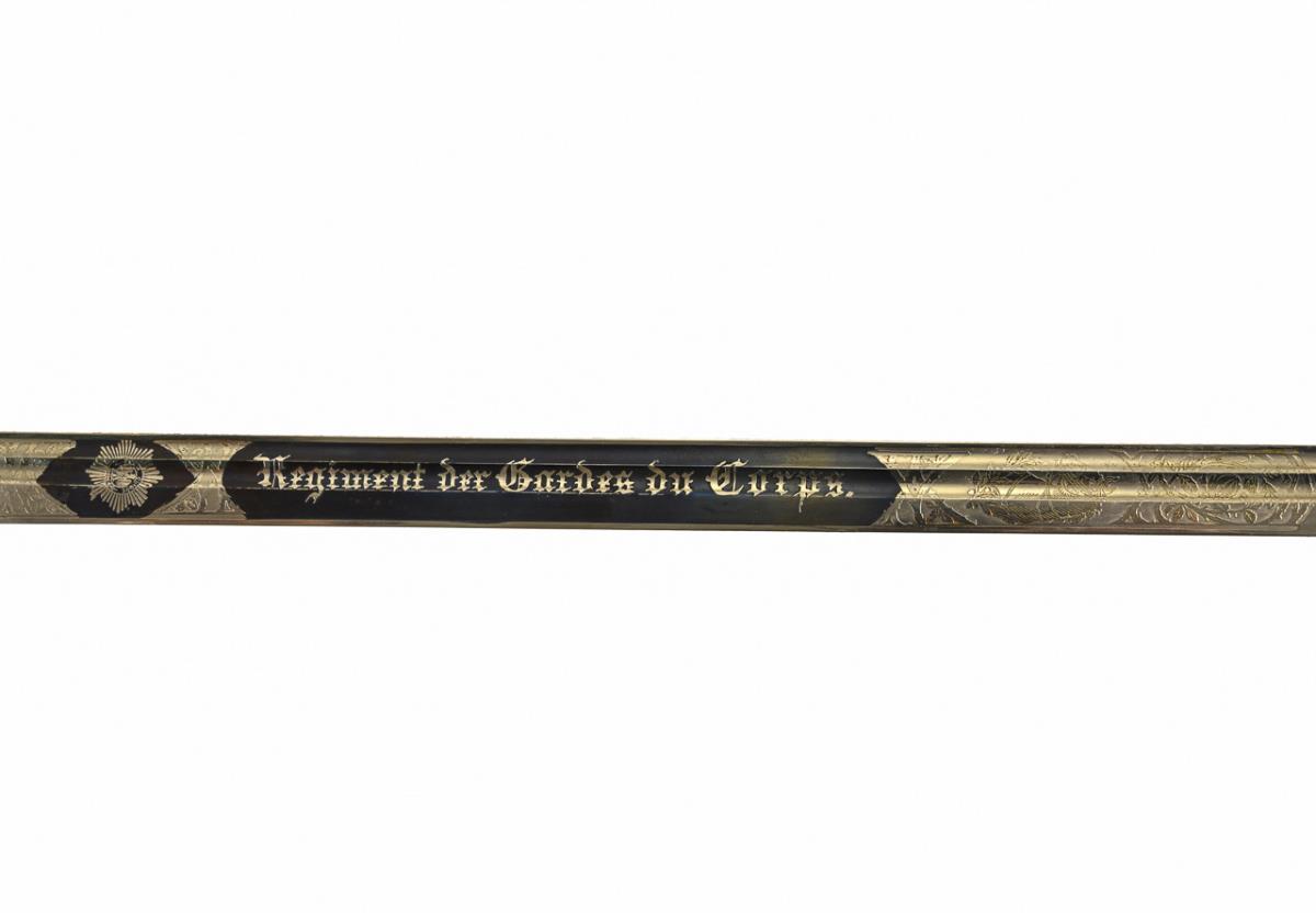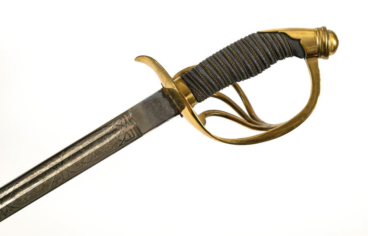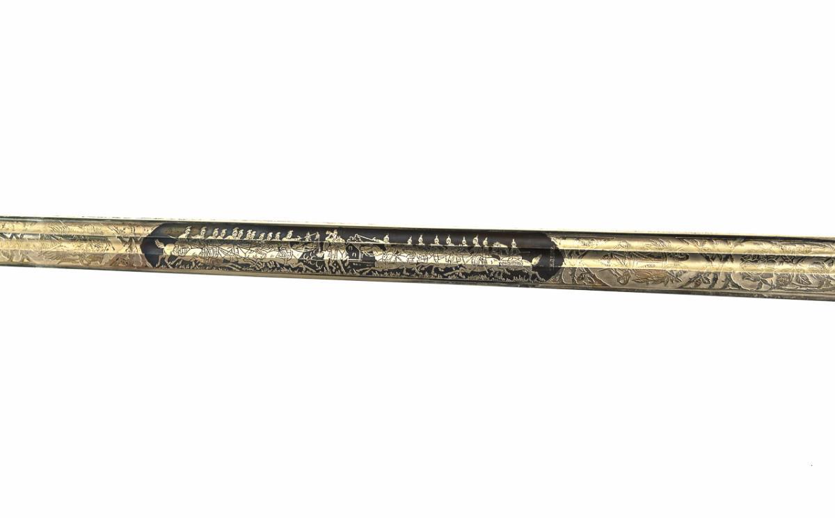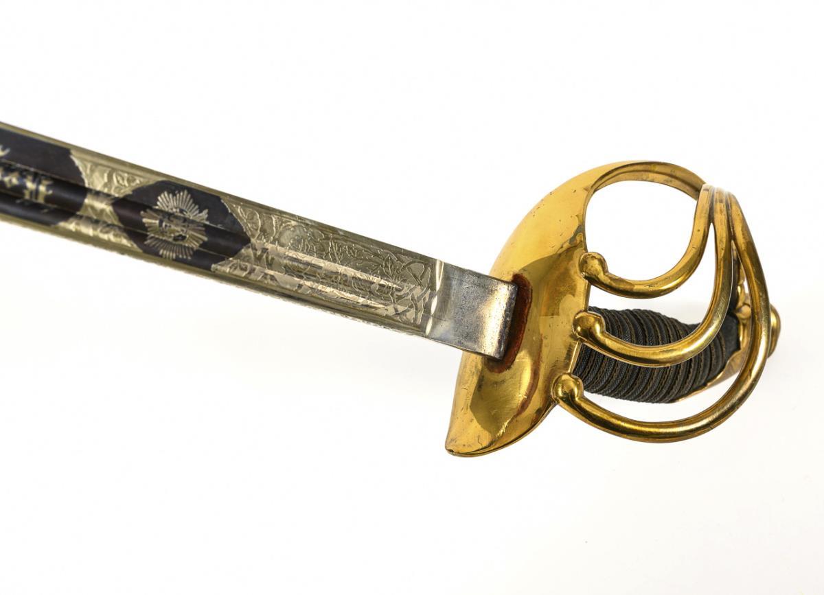 Gerade einschneidige Klinge mit Spitze in der Mittellinie, Klinge geätzt und teils gebläut mit Schriftzug und Truppen zu Pferd. Rücken auch teilweise verziert. Vierspangiges Messinggefäß. Griff leicht abgewinkelt, mit Fischhaut und dreifacher Drahtwicklung. Schwarze Metallscheide mit einem Tragering. Neuwertig.