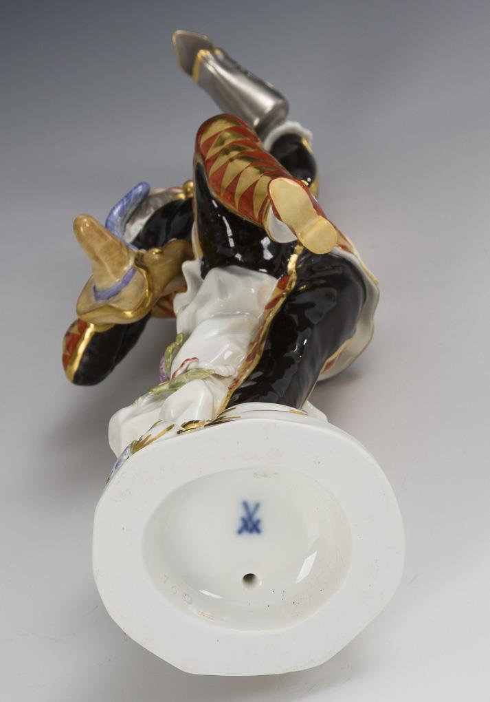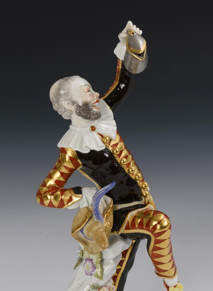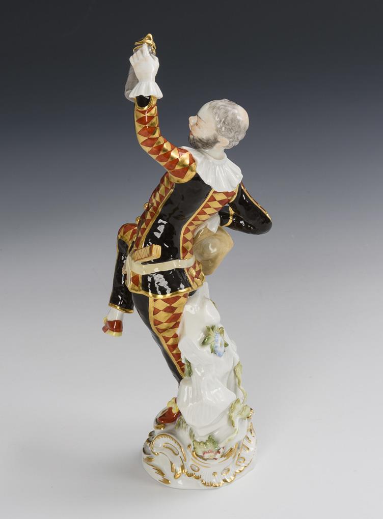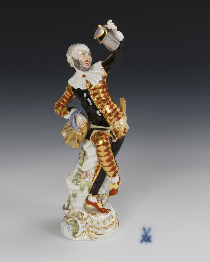 An einem blütenbelegten Felssockel stehender, die Weinkanne erhebender Harlekin mit Klatsche. Auf der Weinkanne die Bezeichnung "ZM 1738", wobei das Z für Zanni, eine Figur der Commedia dell'arte, und das M für Joseph Ferdinand Müller, Königlich-Polnischer und Kurfürstlich-Sächsischer Hofkomödiant steht, der 1738 in Dresden eintraf.